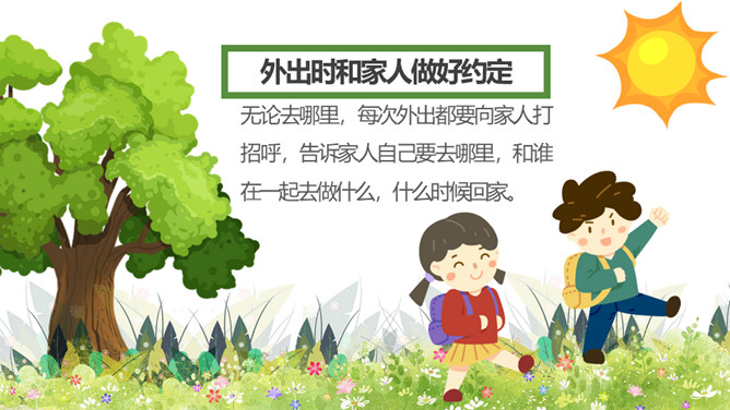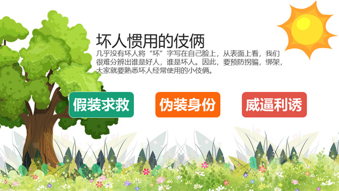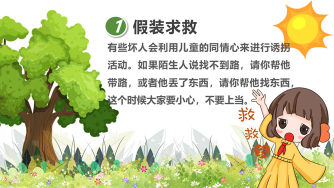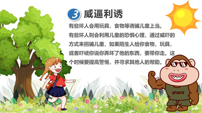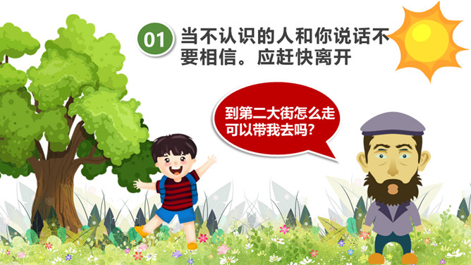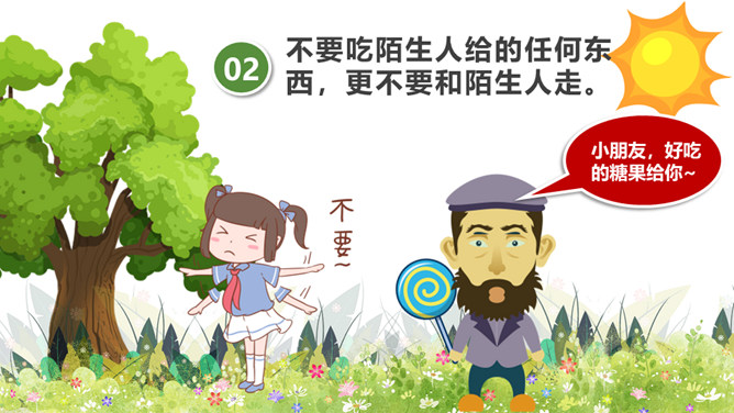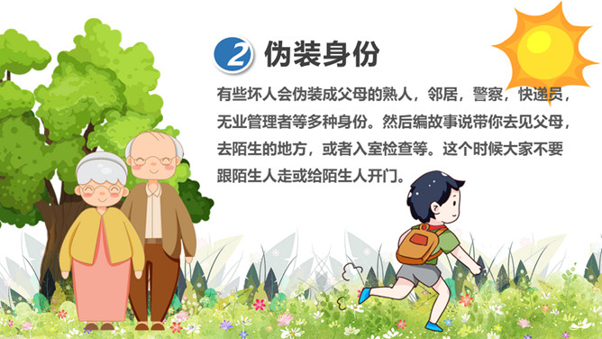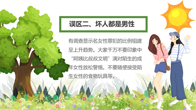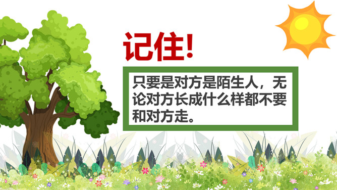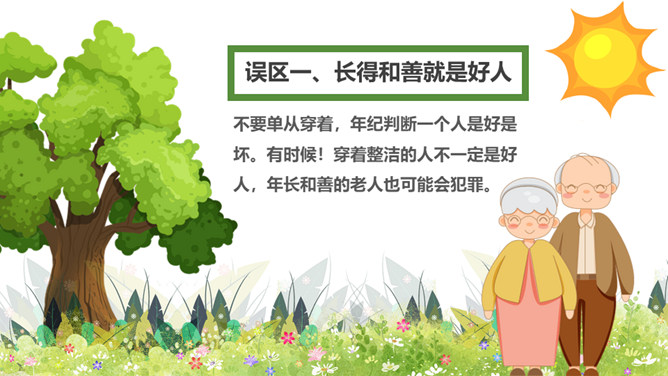 小学生防拐骗教育班会PPT模板。不要单从穿着,年纪判断一个人是好是坏。有时候!穿着整洁的人不一定是好人,年长和善的老人也可能会犯罪。有调查显示名女性罪犯的比例组建呈上升趋势。大家千万不要印象中“阿姨比叔叔文明”滴对陌生的成年女性放松警惕。不要随便接受陌生女性的食物玩具等。