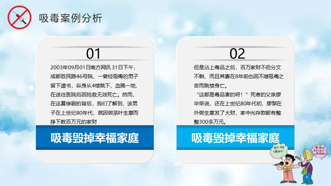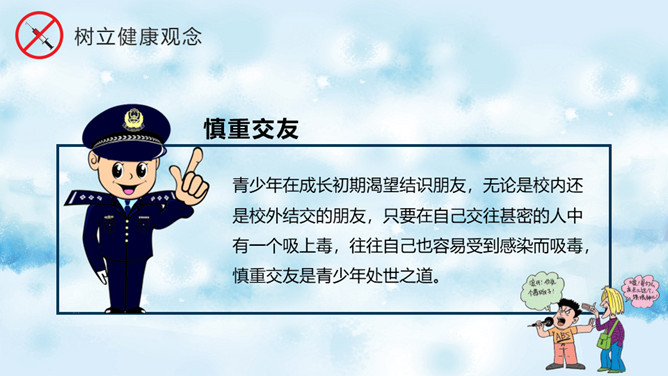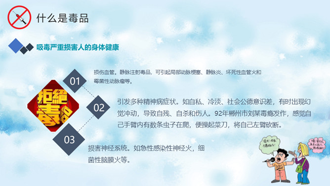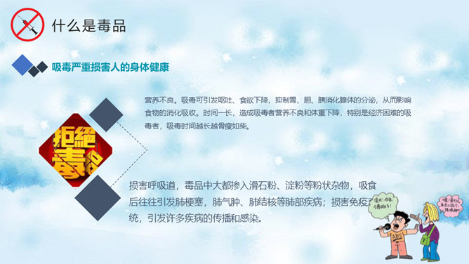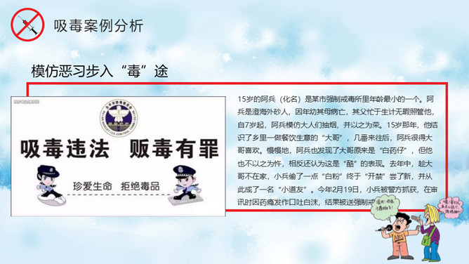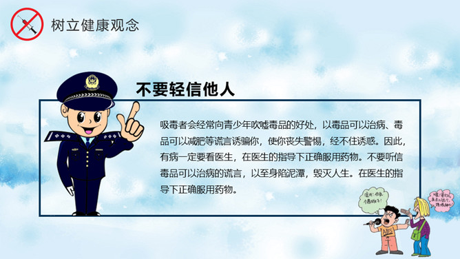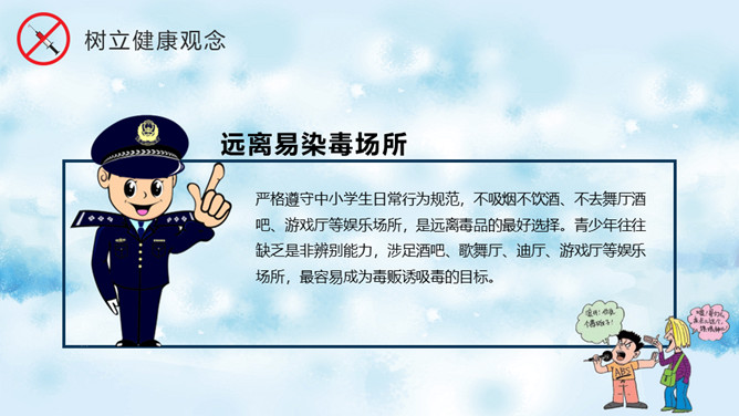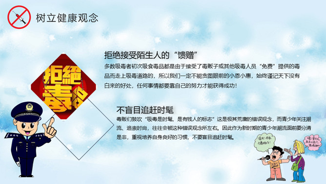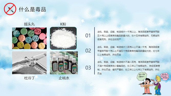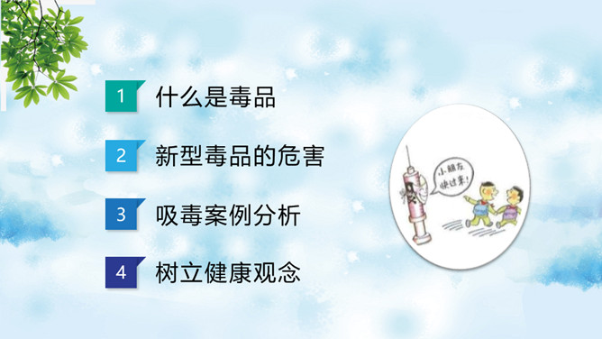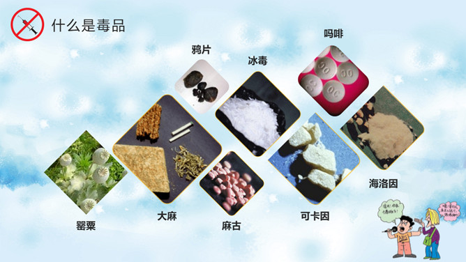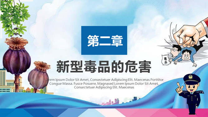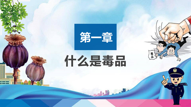 远离毒品禁毒教育班会PPT模板。内容包括什么是毒品、新型毒品的危害、吸毒案例分析、树立健康观念。
