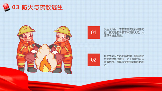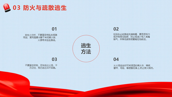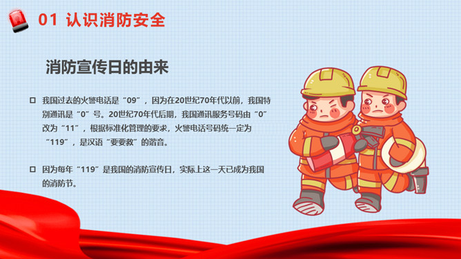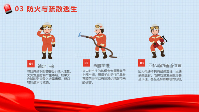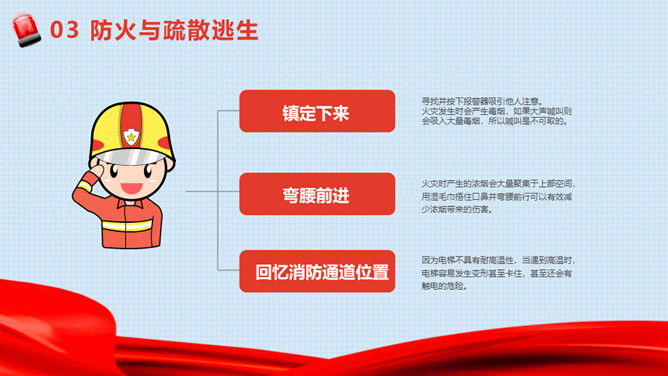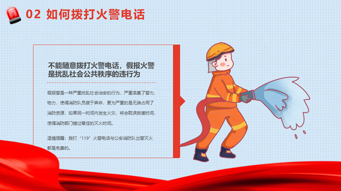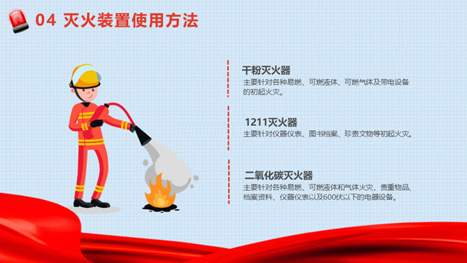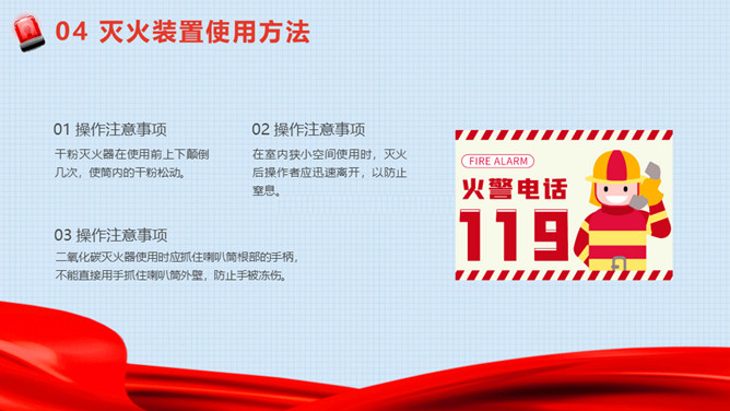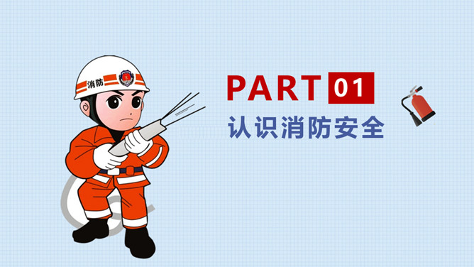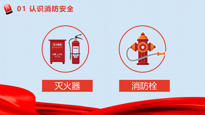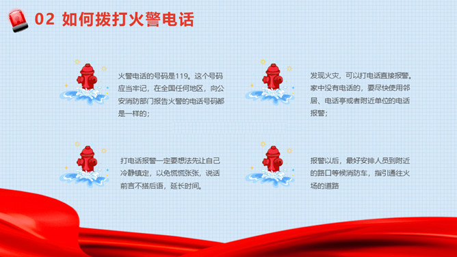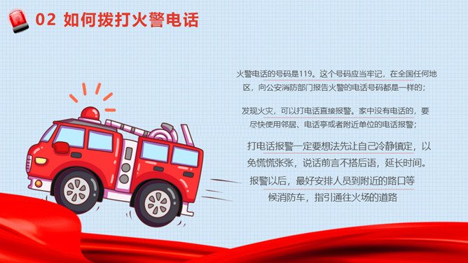 中小学消防安全教育班会PPT模板。内容包括认识消防安全、如何拨打火警电话、防火与疏散逃生、灭火装置使用方法。