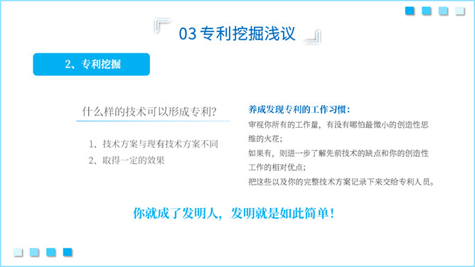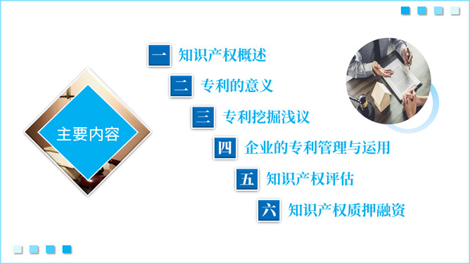 知识产权知识培训PPT模板。内容包括知识产权概述、专利的意义、专利挖掘浅议、企业的专利管理与运用、知识产权评估、知识产权质押融资。