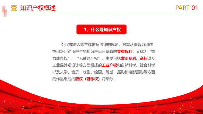 公民或法人等主体依据法律的规定,对其从事智力创作或创新活动所产生的知识产品所享有的专有权利,又称为“智力成果权”、“无形财产权”,主要包括发明专利、商标以及工业品外观设计等方面组成的工业产权和自然科学、社会科学以及文学、音乐、戏剧、绘画、雕塑、摄影和电影摄影等方面的作品组成的版权(著作权)两部分。