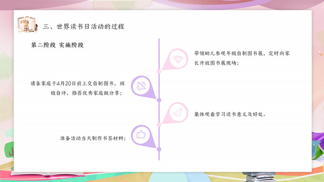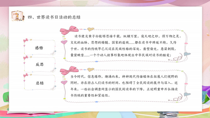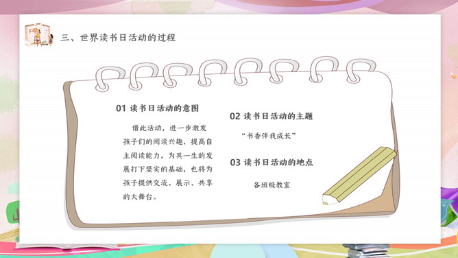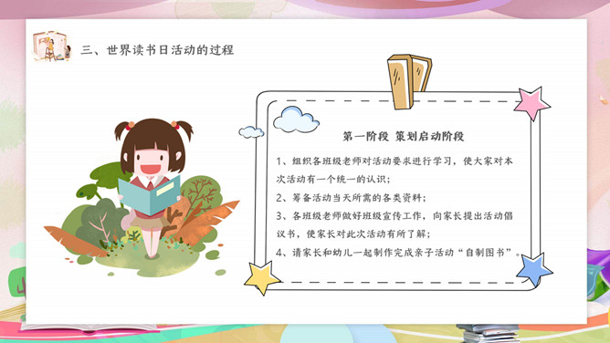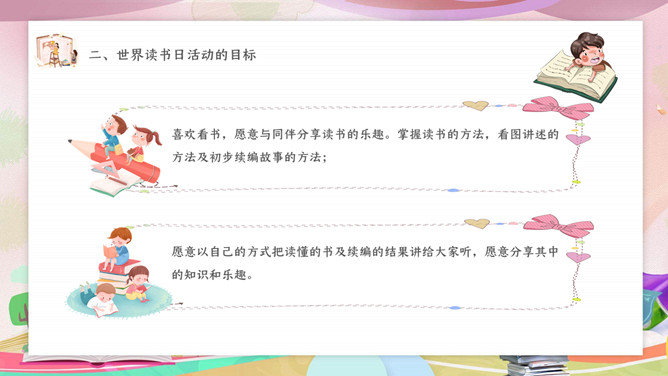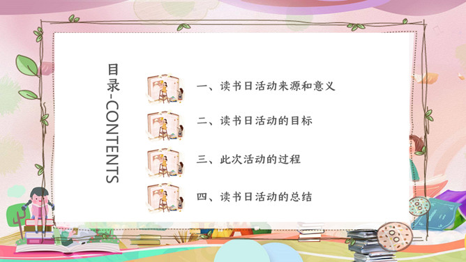 卡通世界读书日主题班会PPT模板。内容包括读书日活动来源和意义、读书日活动的目标、此次活动的过程、读书日活动的总结。