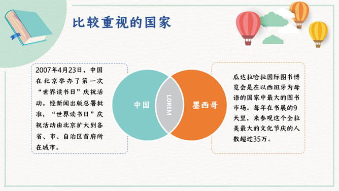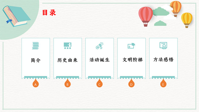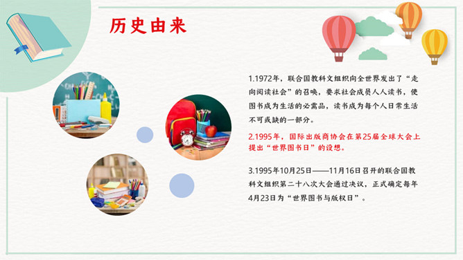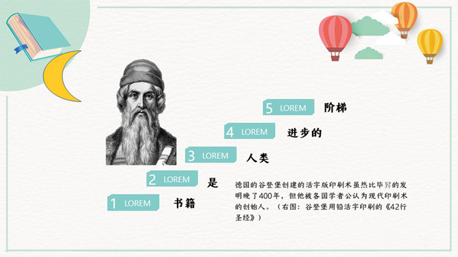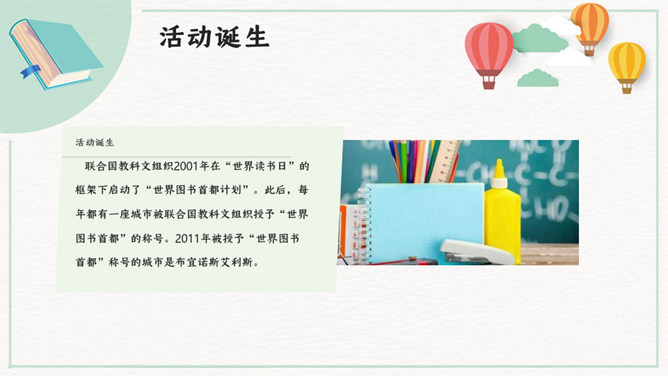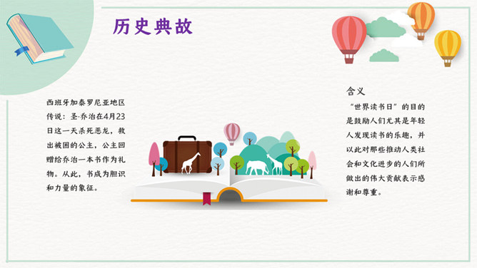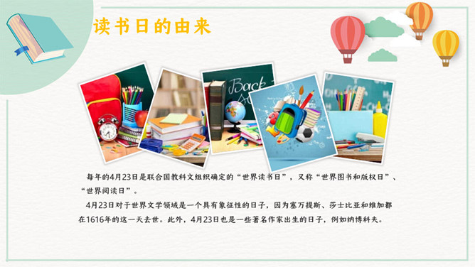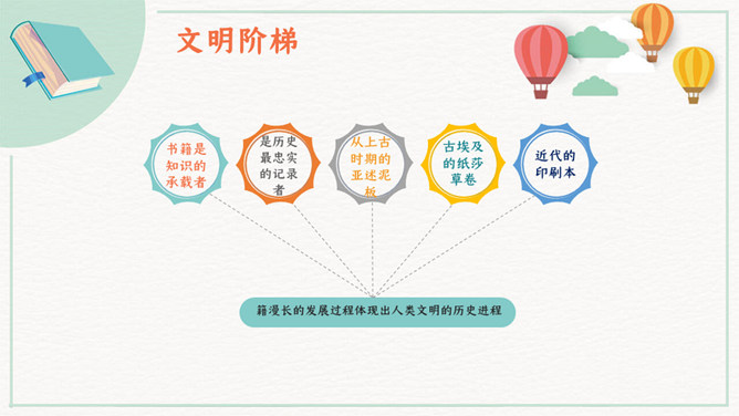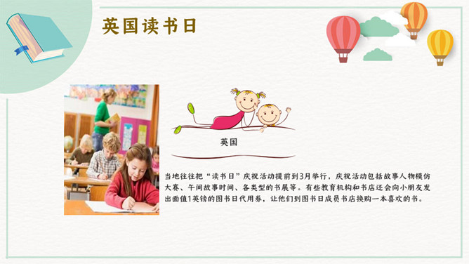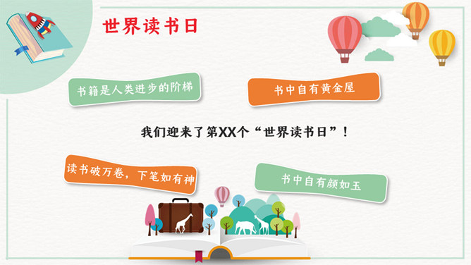 卡通儿童世界读书日PPT模板。书籍是人类进步的阶梯,内容包括简介、历史由来、活动诞生、文明阶梯、方法感悟。