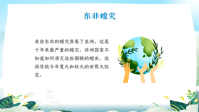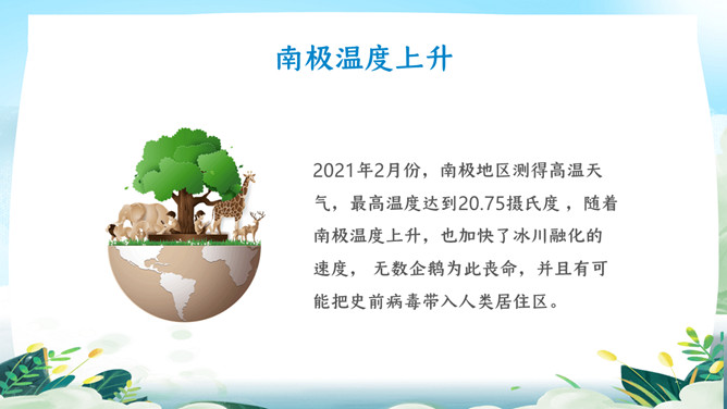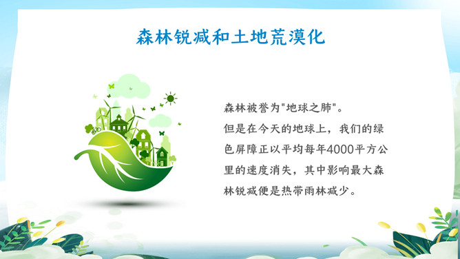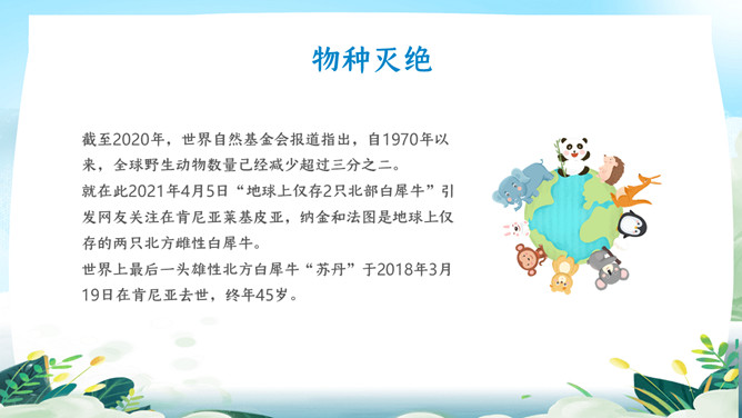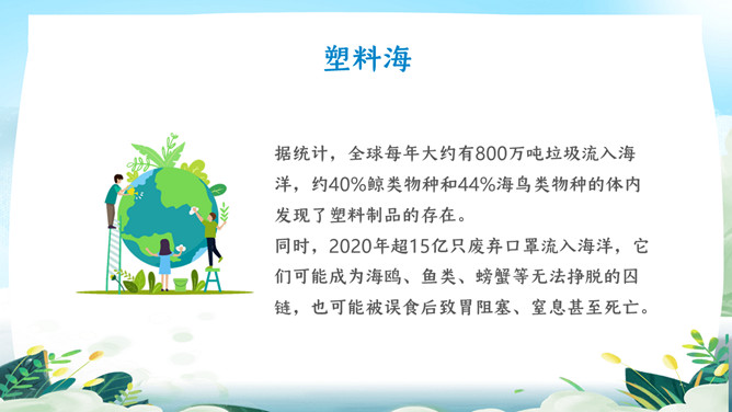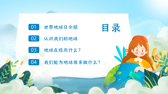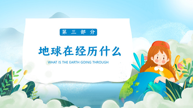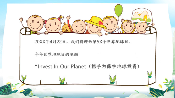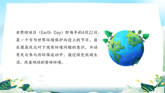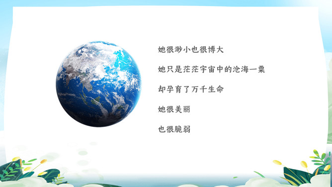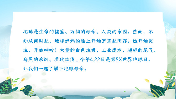 珍爱地球世界地球日PPT模板。地球是生命的摇篮、万物的母亲、人类的家园。然而,不知从何时起,地球妈妈的脸上开始笼罩起阴霾。她开始哭泣,开始呻吟!大量的白色垃圾、工业废水、超标的尾气、乌黑的浓烟、滥砍滥伐....今年4.22日是第5X世界地球日,让我们一起了解下地球母亲。