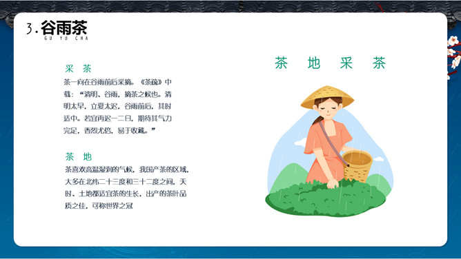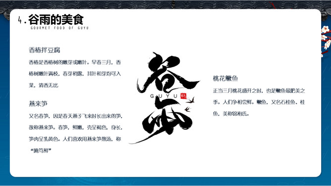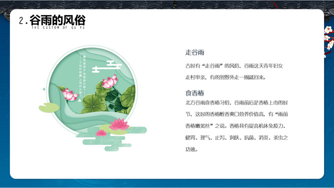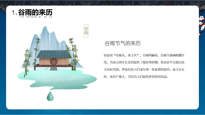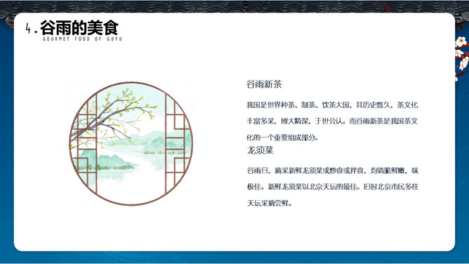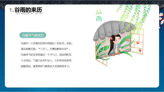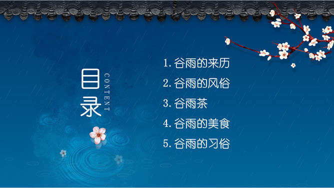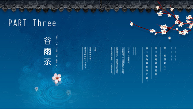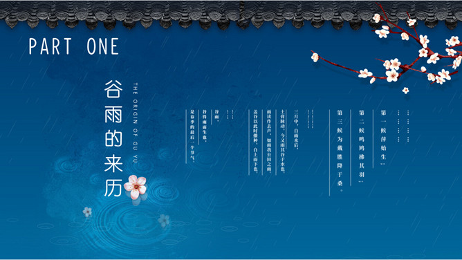 谷雨节气介绍PPT模板。一套谷雨节气介绍模板,古风屋檐、梅花背景,简约设计,动态播放。