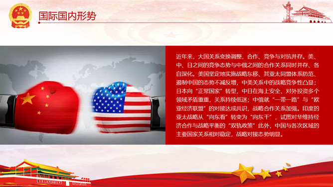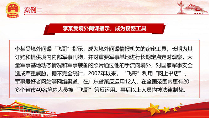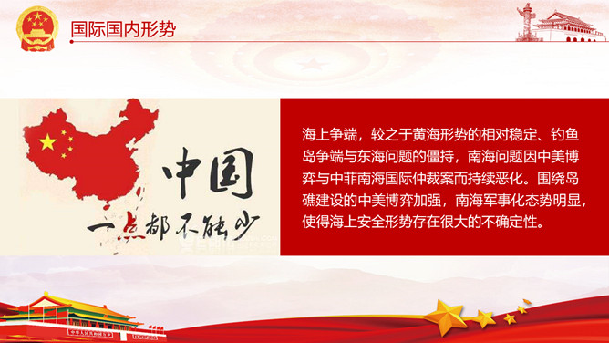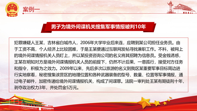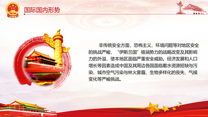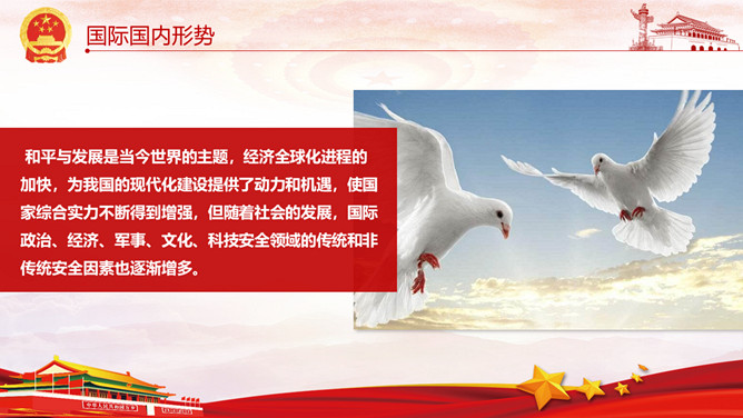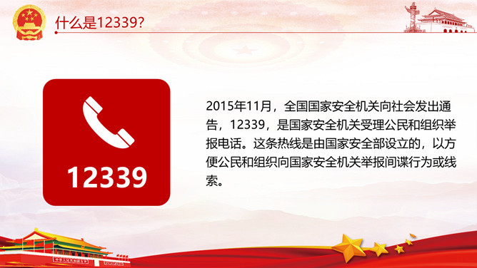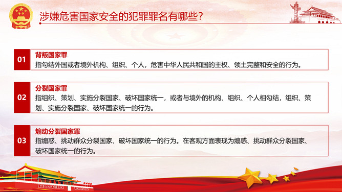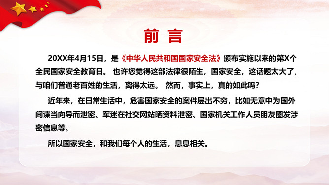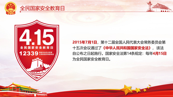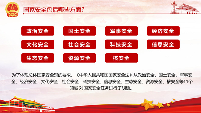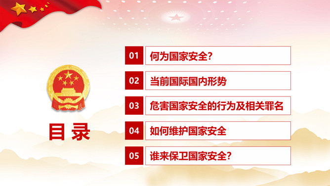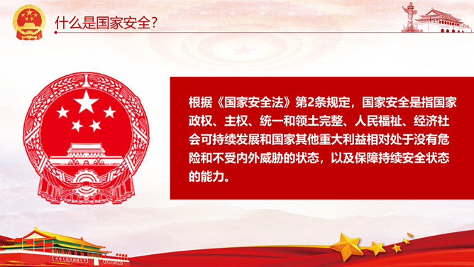 全民国家安全教育日宣传PPT模板。内容包括何为国家安全、当前国际国内形势、危害国家安全的行为及相关罪名、如何维护国家安全、谁来保卫国家安全?