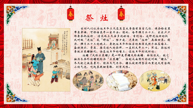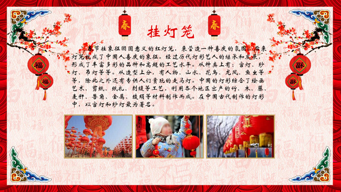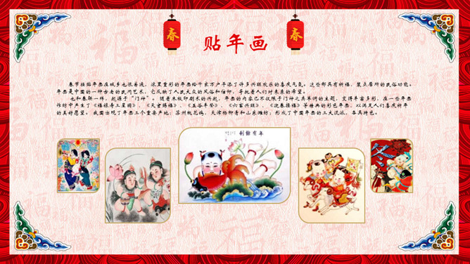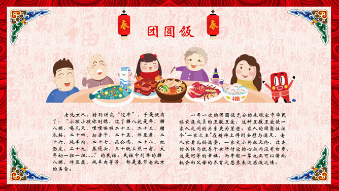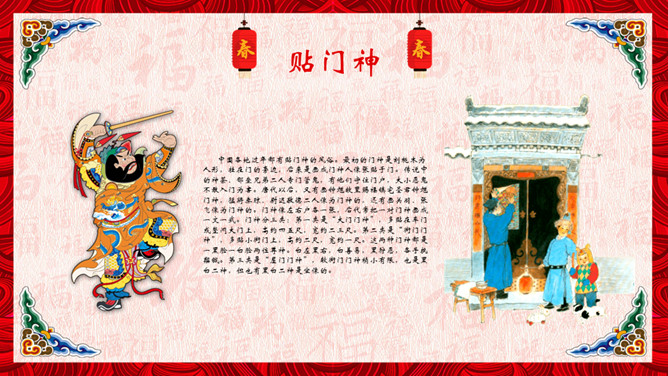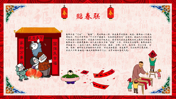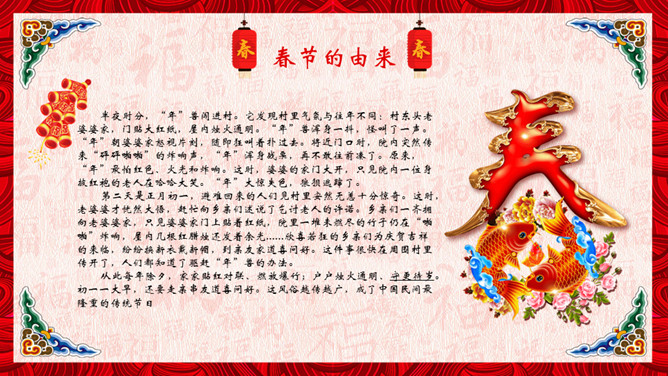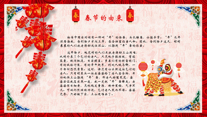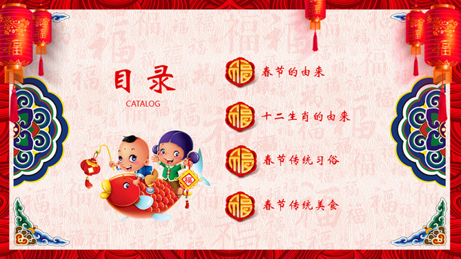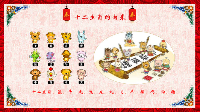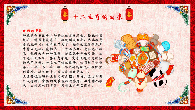 春节传统习俗文化PPT模板。内容包括春节的由来、十二生肖的由来、春节传统习俗、春节传统美食。