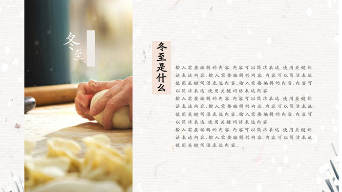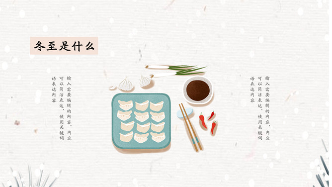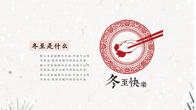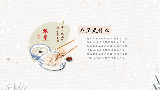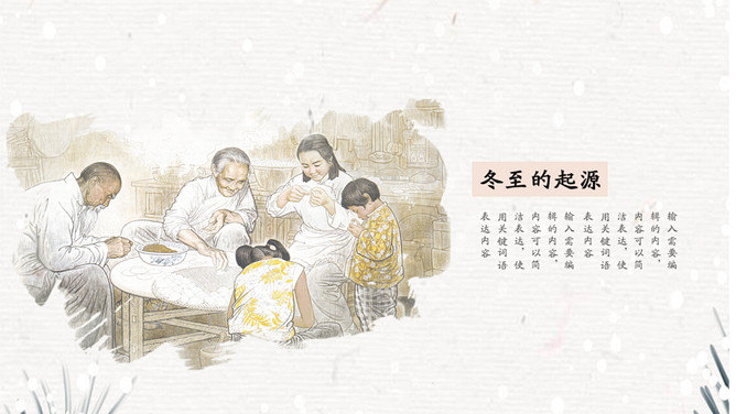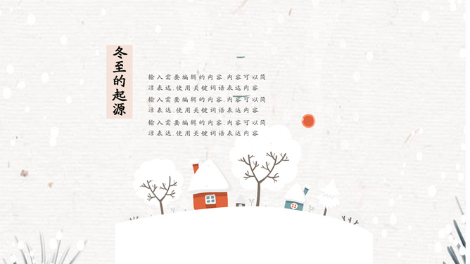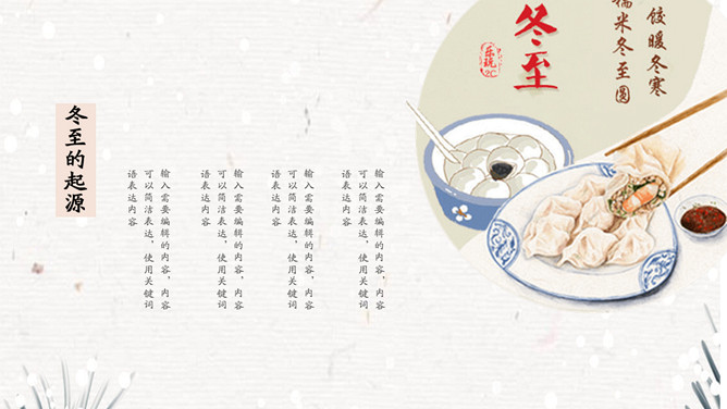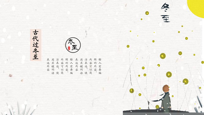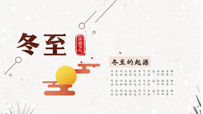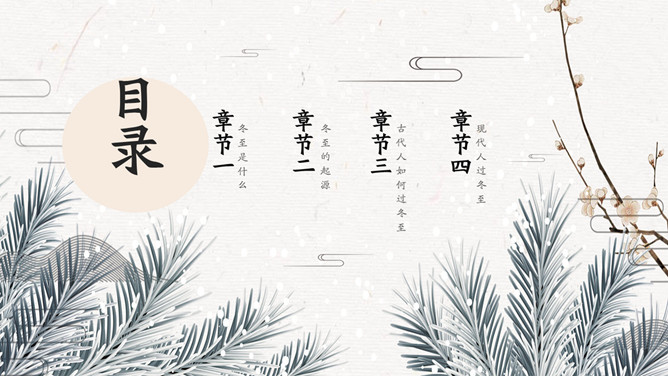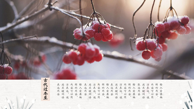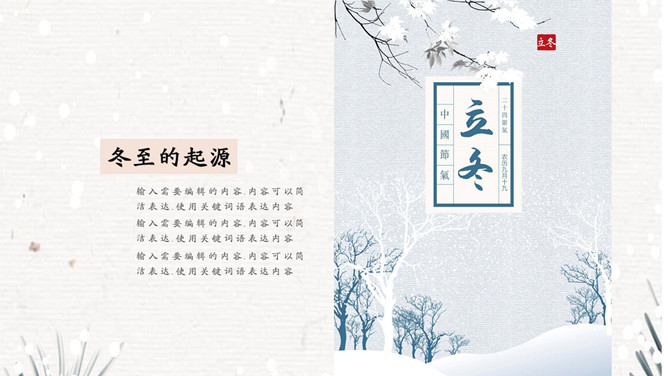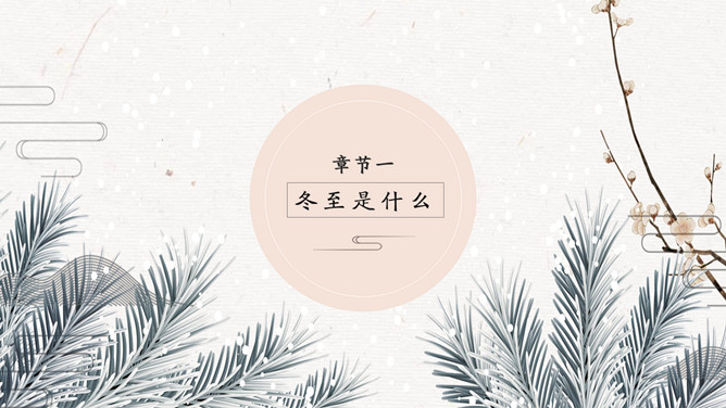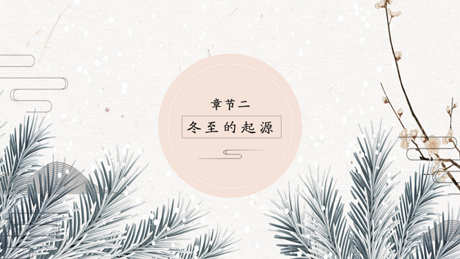 下雪冬至节气主题PPT模板。内容包括冬至是什么、冬至的起源、古代人如何过冬至、现代人过冬至。