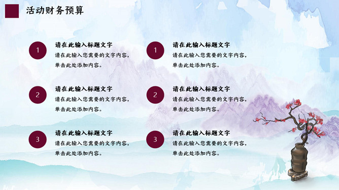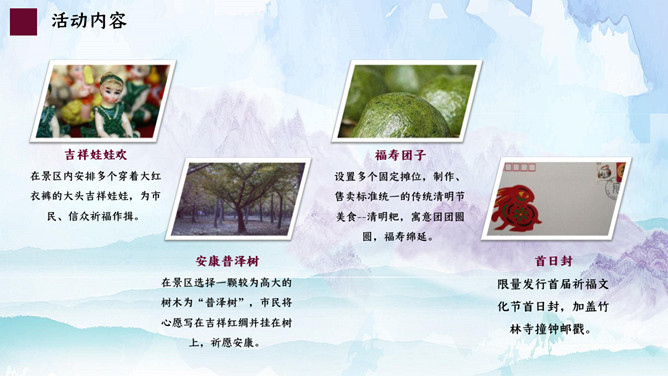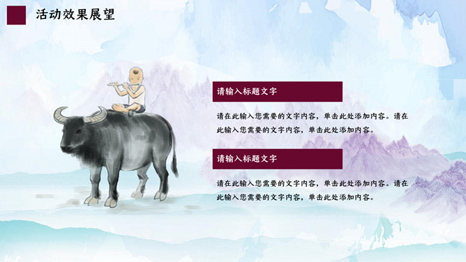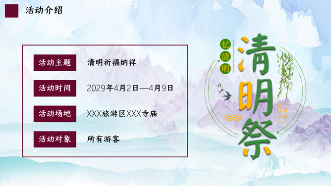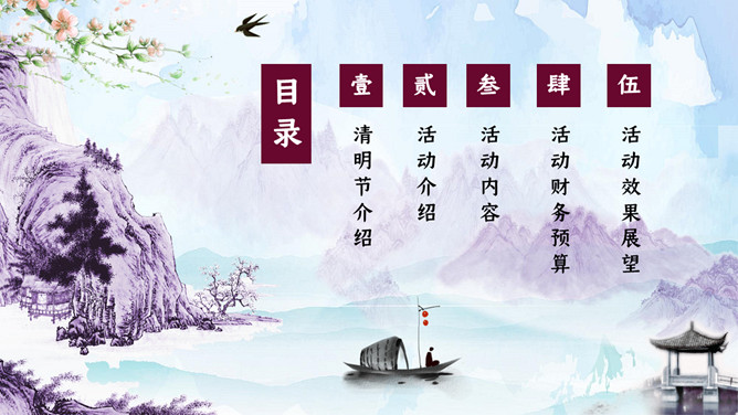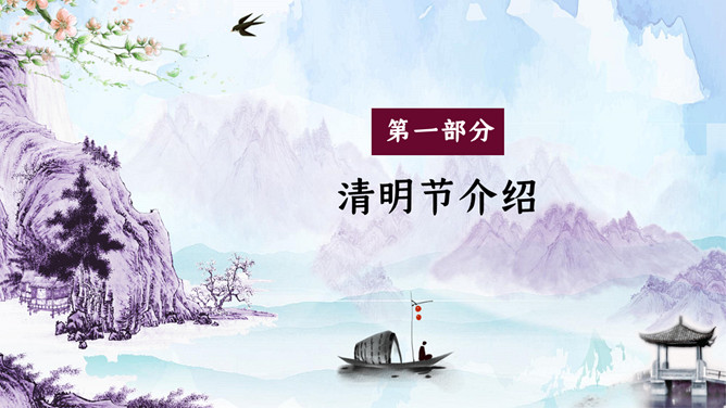 水墨山水清明节活动PPT模板。一套清明节主题模板,古典水墨山水背景,适用于清明活动策划等用途。