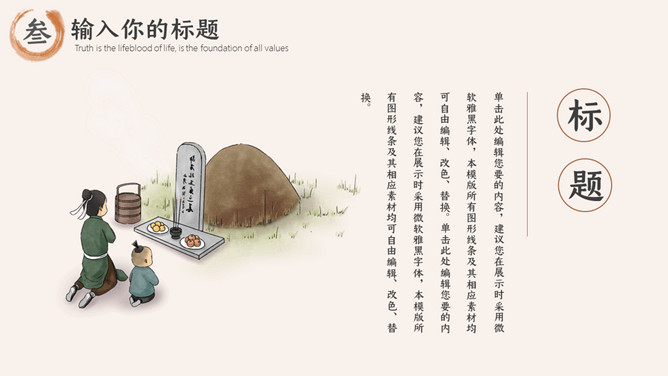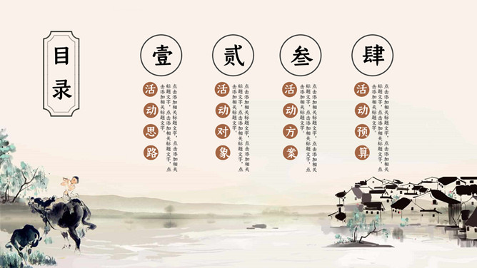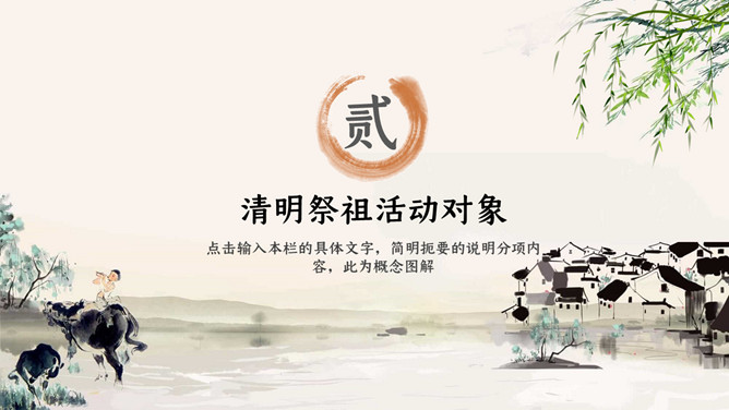 清明缅怀祖先祭祀扫墓PPT模板。一套清明节主题模板,水墨牧童、村庄背景,适用于清明节祭祀相关内容。