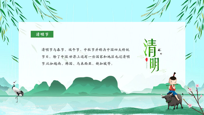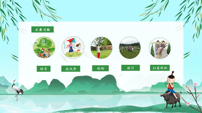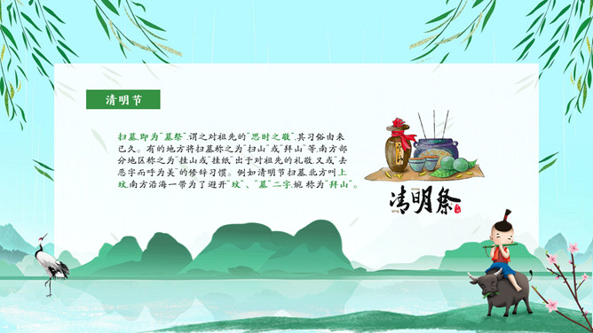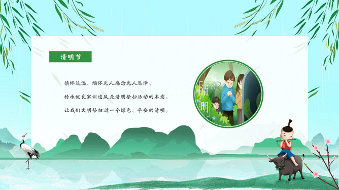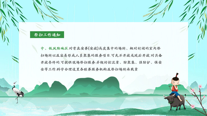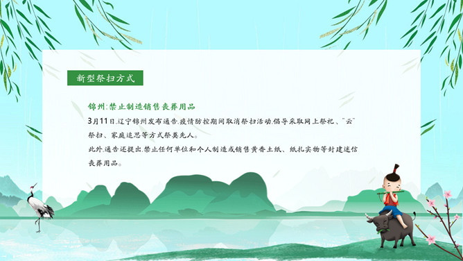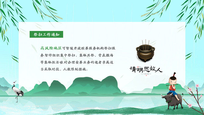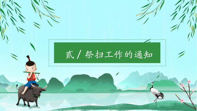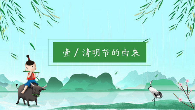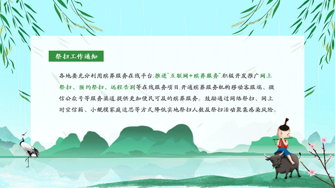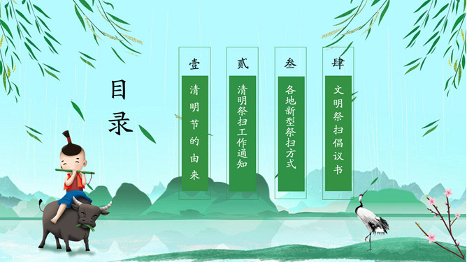 牧童春天清明文明祭扫PPT模板。内容包括清明节的由来、清明祭扫工作通知、各地新型祭扫方式、文明祭扫倡议书。