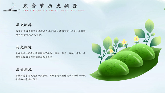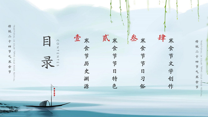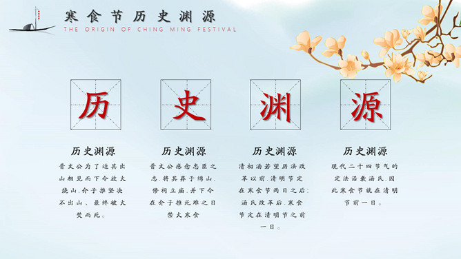 淡雅古风寒食节主题PPT模板。内容包括寒食节历史渊源、寒食节节日特色、寒食节节日习俗、寒食节文学创作。