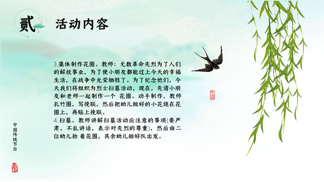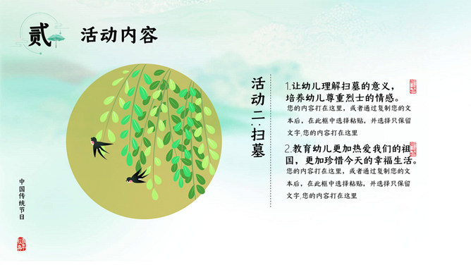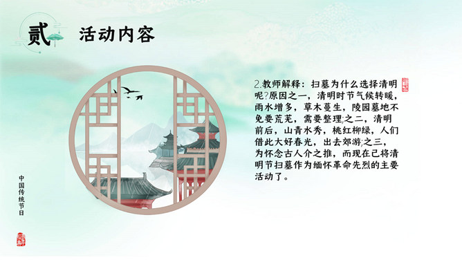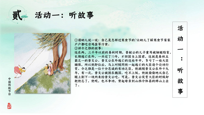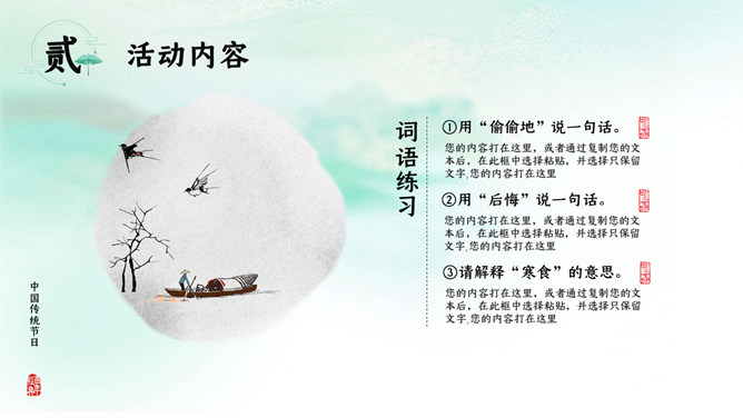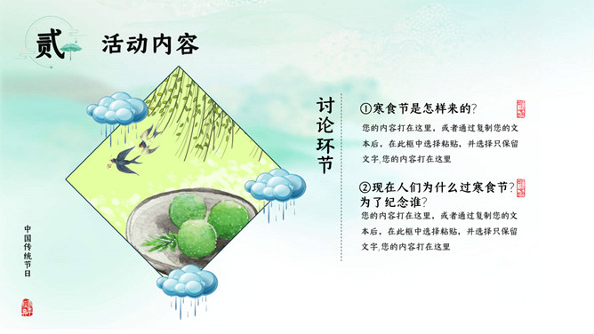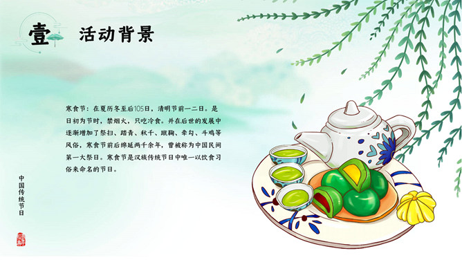寒食节:在夏历冬至后105日,清明节前一二日。是日初为节时,禁烟火,只吃冷食。并在后世的发展中逐渐增加了祭扫、踏青、秋千、蹴鞠、牵勾、斗鸡等风俗,寒食节前后绵延两千余年,曾被称为中国民间第一大祭日。寒食节是汉族传统节日中唯一以饮食习俗来命名的节日。