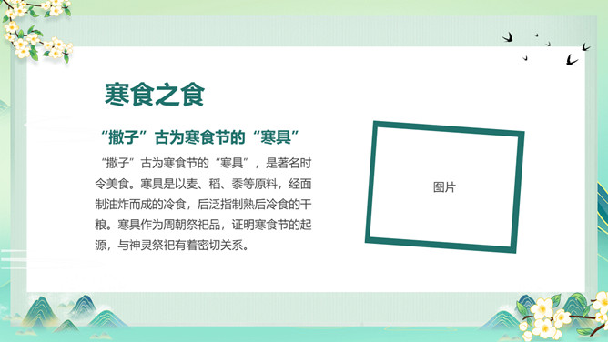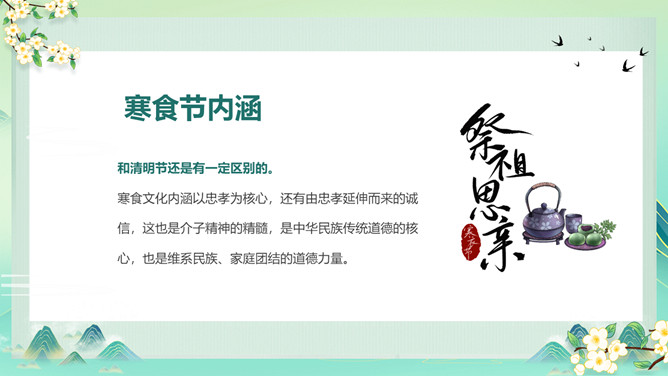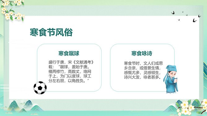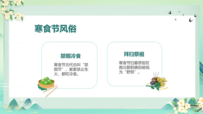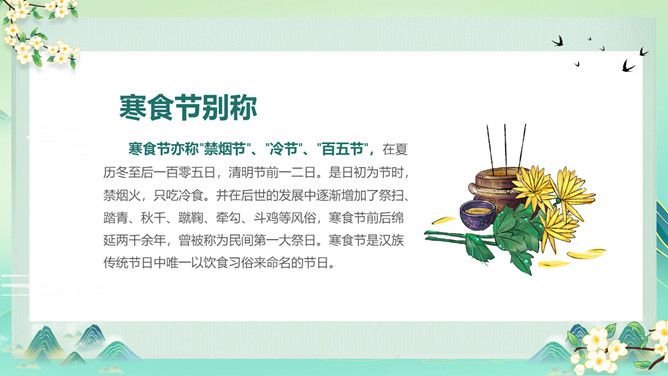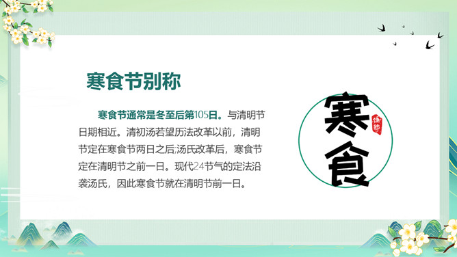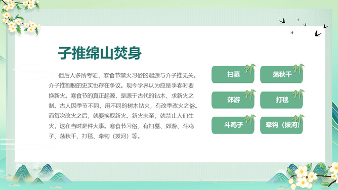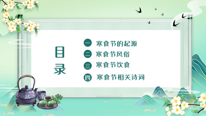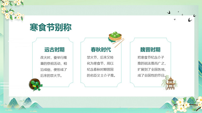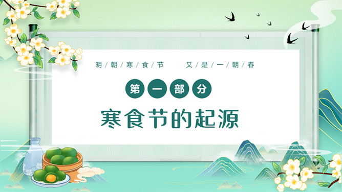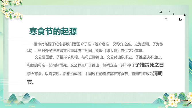 唯美古风寒食节介绍PPT模板。寒食节的起源:相传此俗源于纪念春秋时晋国介子推(姓介名推,又称介之推,之为虚词,子为敬称)。当时介子推与晋文公重耳流亡列国,割股(即大腿)肉供文公充饥。