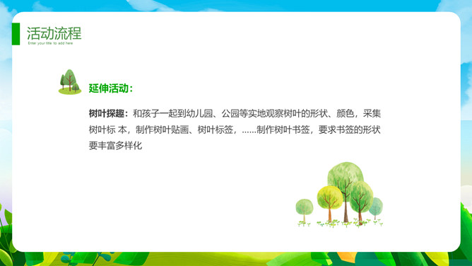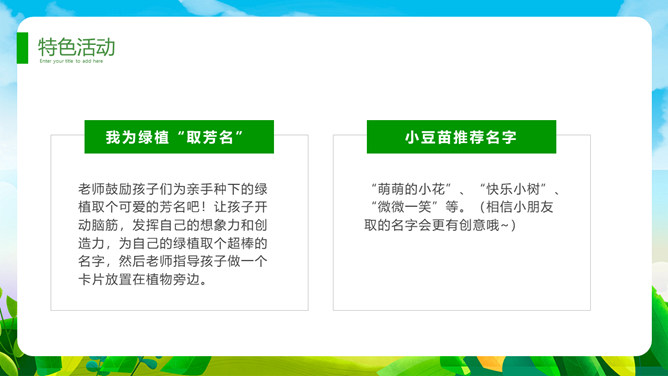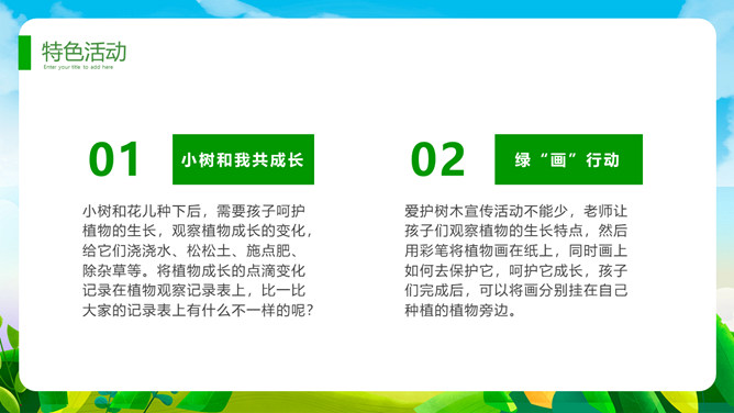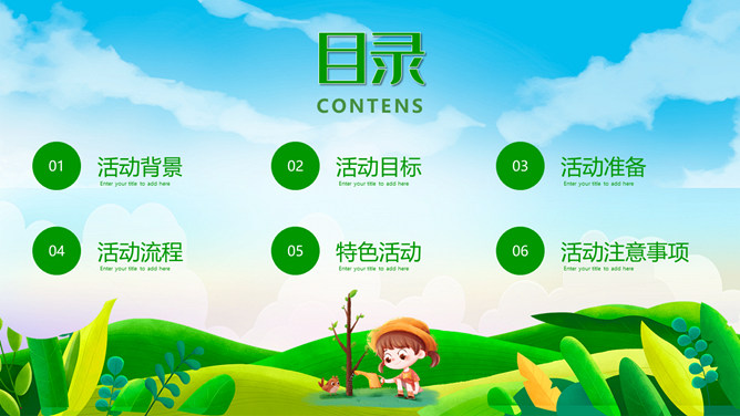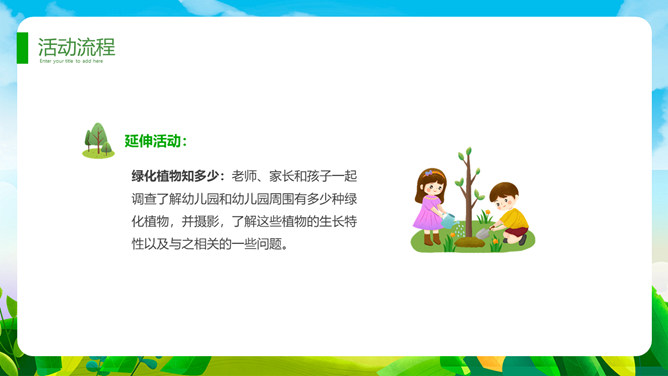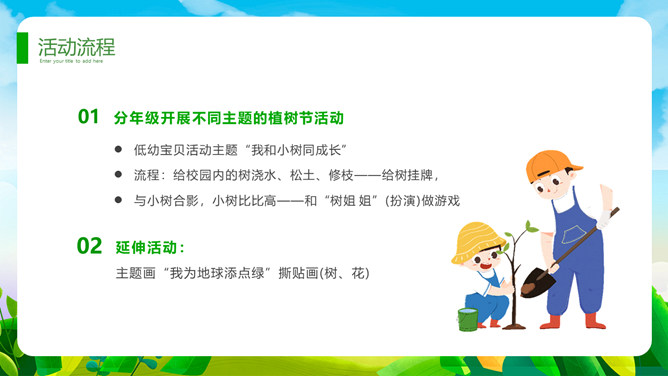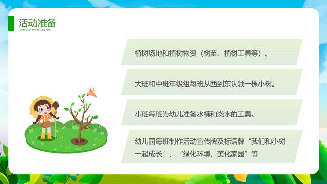 植树节班会课件PPT模板。一套植树节主题模板,卡通设计风格,清新绿色主色调。