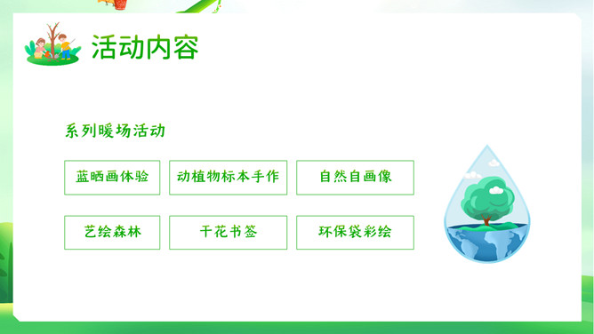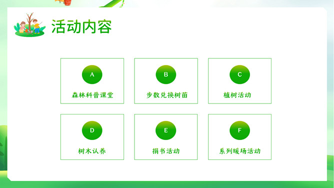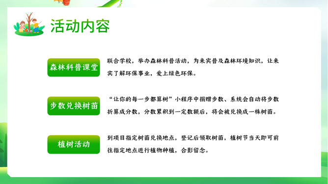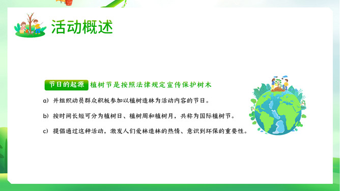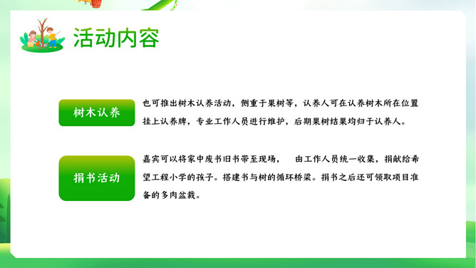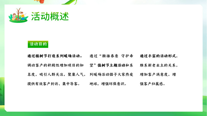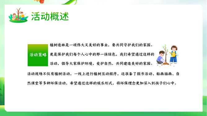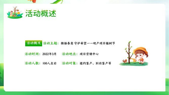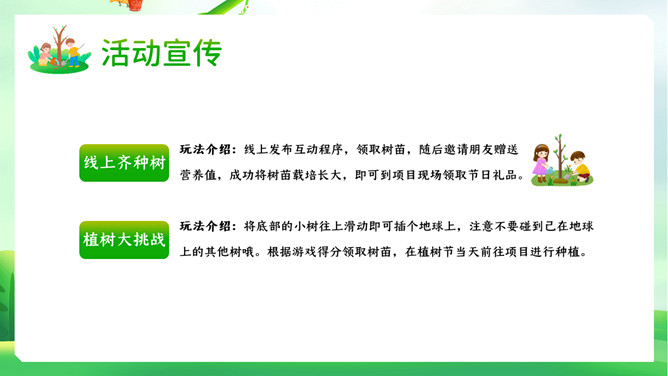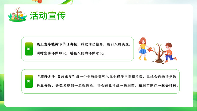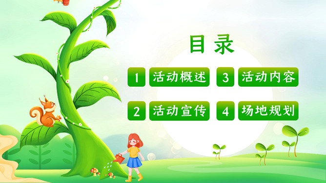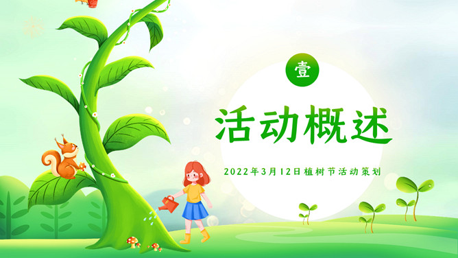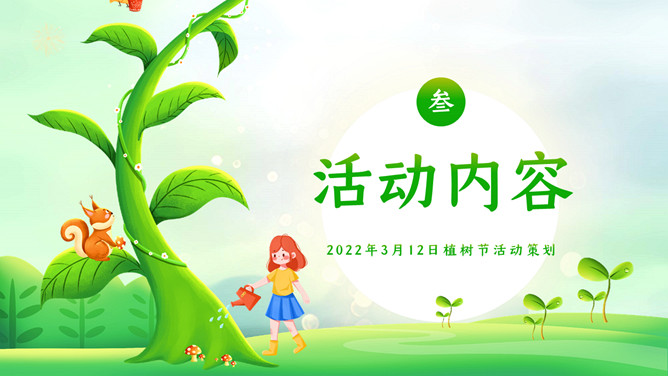 撒播春意守护希望植树节PPT模板。一套3月12日植树节活动策划模板,草地、大树和浇水的小女孩背景。