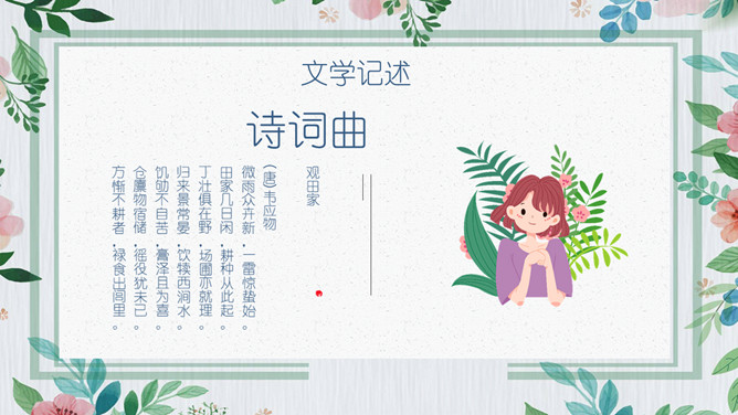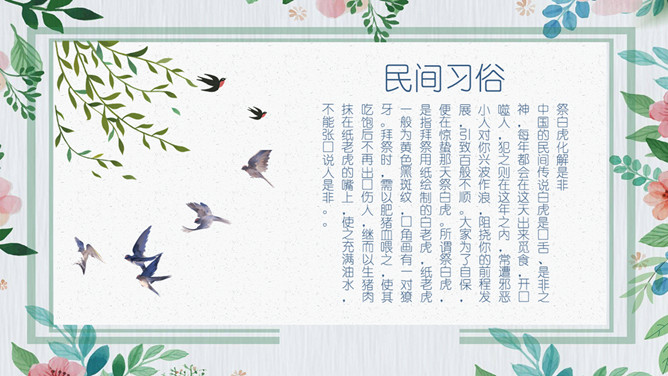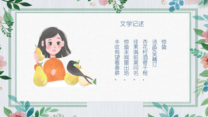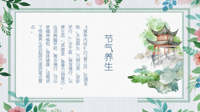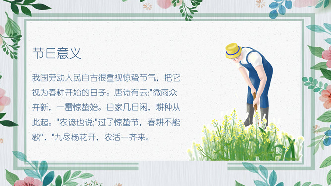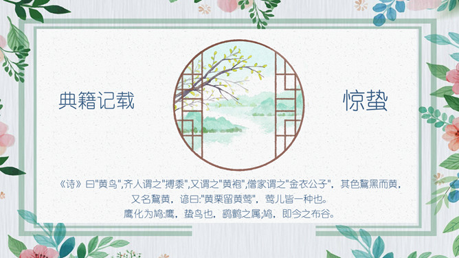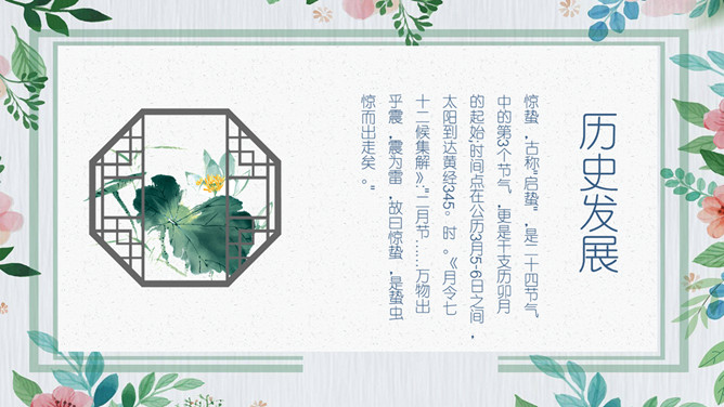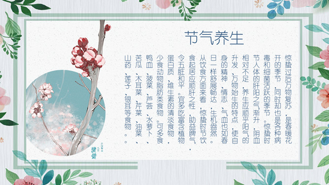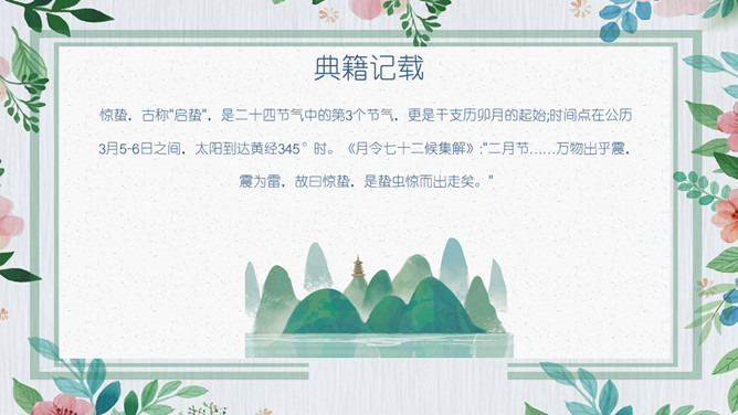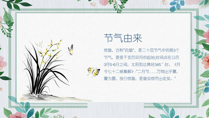 水彩花边植物惊蛰PPT模板。惊蛰,古称"启蛰",是二十四节气中的第3个节气,更是干支历卯月的起始;时间点在公历3月5-6日之间,太阳到达黄经345°时。