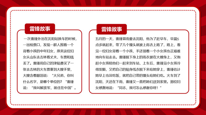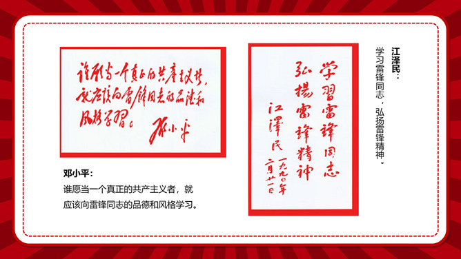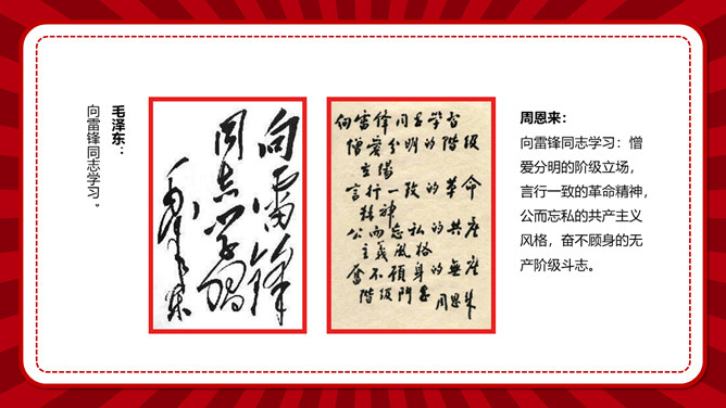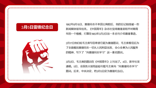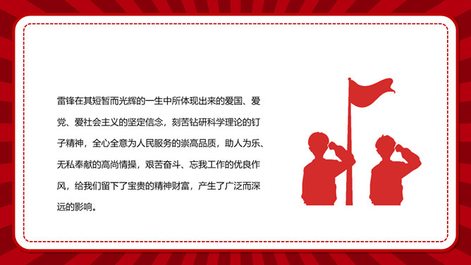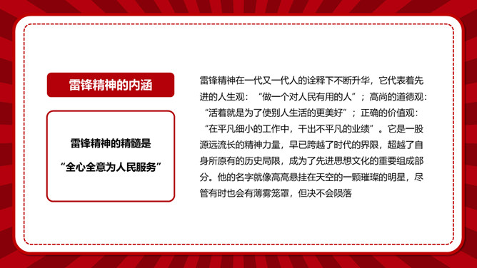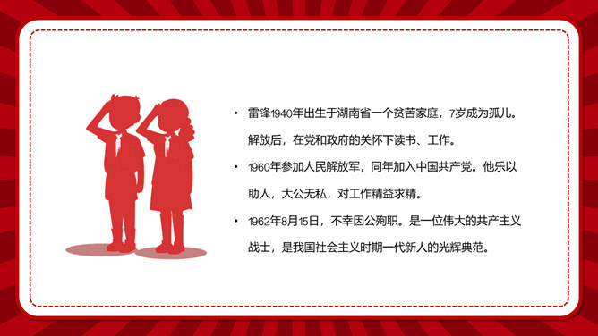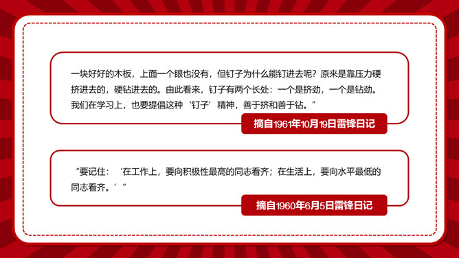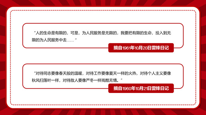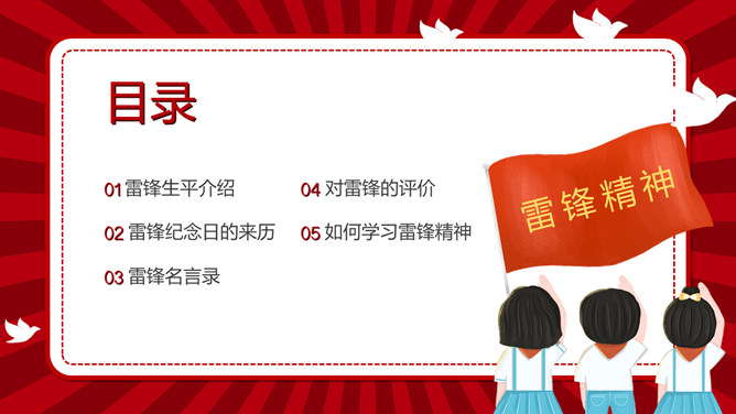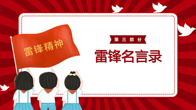 学习雷锋精神主题班会PPT模板。内容包括雷锋生平介绍、雷锋纪念日的来历、雷锋名言录、对雷锋的评价、如何学习雷锋精神。