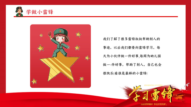 我们了解了很多雷锋叔叔帮助别人的事迹,以后我们都要向雷锋学习,每天为小伙伴做一件好事,每周为幼儿园做一-件好事,帮助了别人,自己也会很快乐!看谁是最棒的小雷锋!