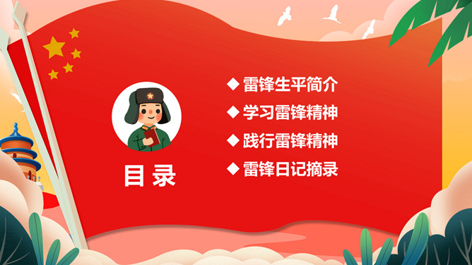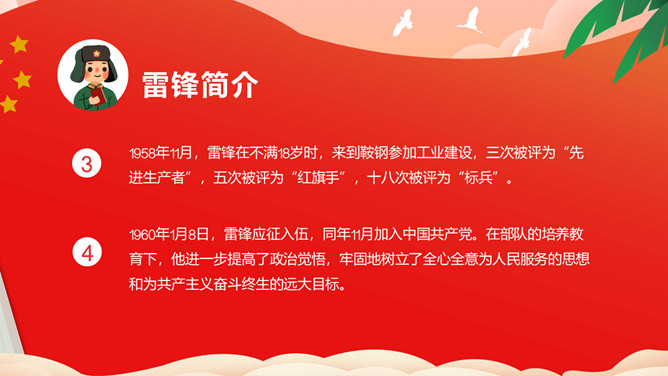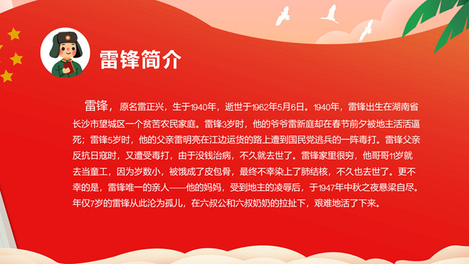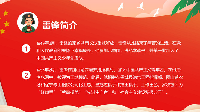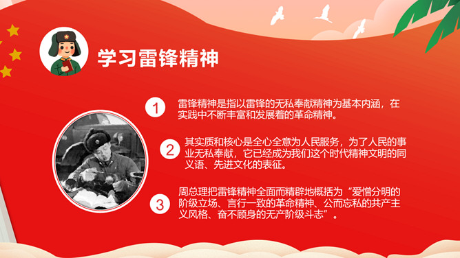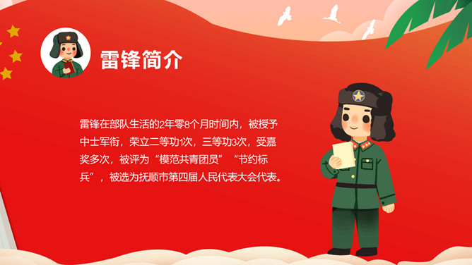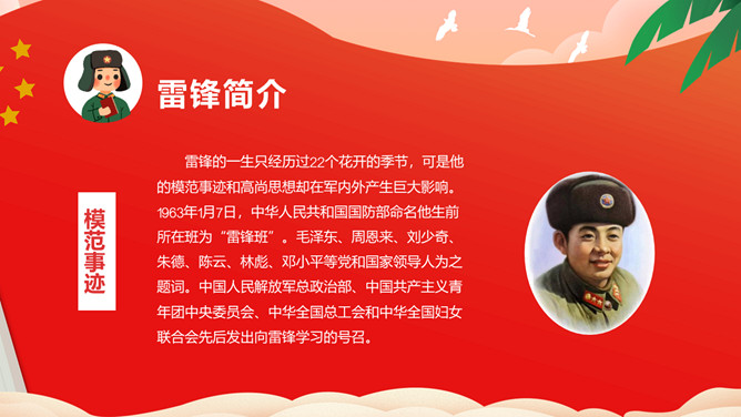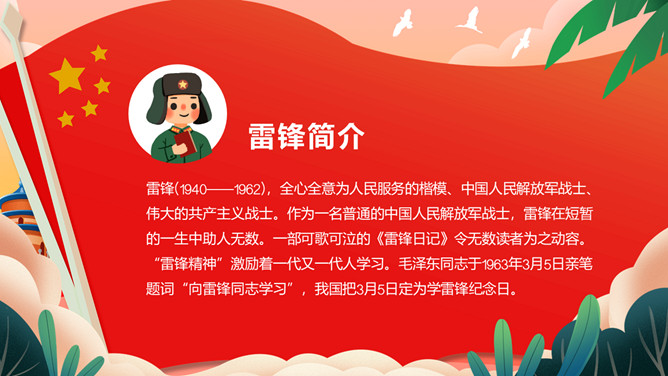 雷锋(1940——1962),全心全意为人民服务的楷模、中国人民解放军战士、伟大的共产主义战士。作为一名普通的中国人民解放军战士,雷锋在短暂的一生中助人无数。一部可歌可泣的《雷锋日记》令无数读者为之动容。“雷锋精神”激励着一代又一代人学习。毛泽东同志于1963年3月5日亲笔题词“向雷锋同志学习”,我国把3月5日定为学雷锋纪念日。