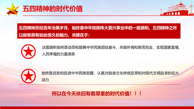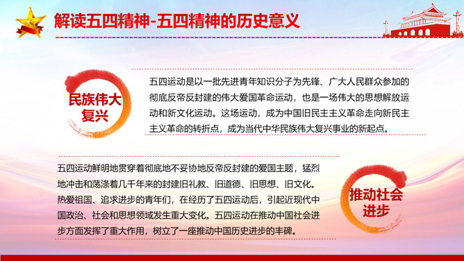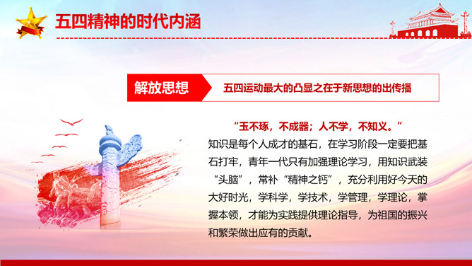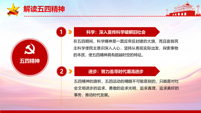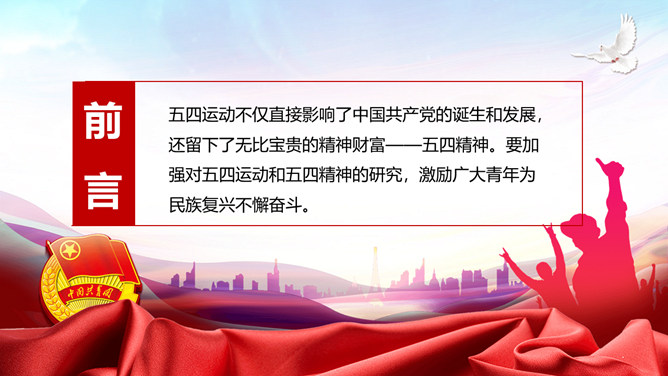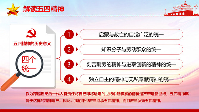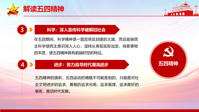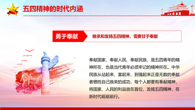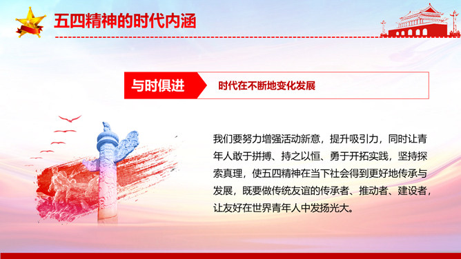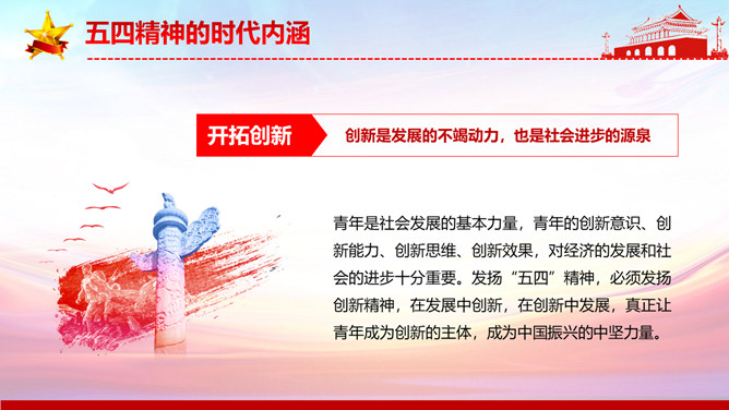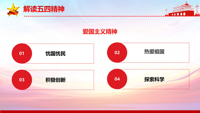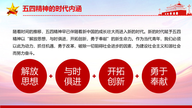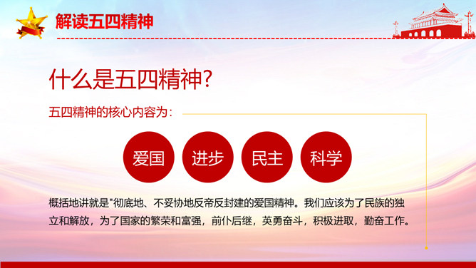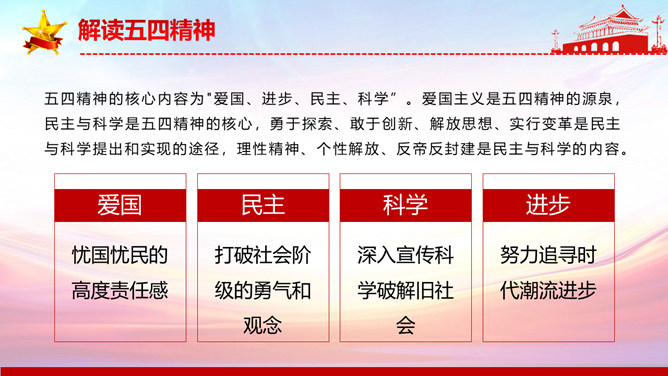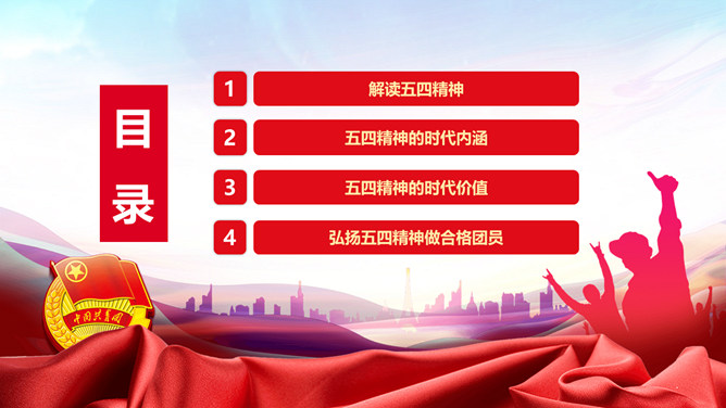 弘扬五四精神做合格共青团员PPT模板。内容包括解读五四精神、五四精神的时代内涵、五四精神的时代价值、弘扬五四精神做合格团员。