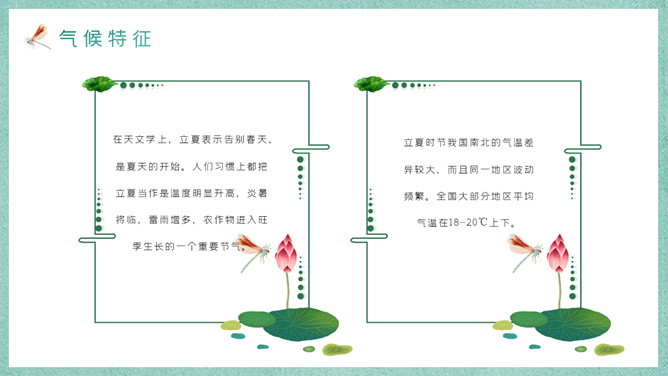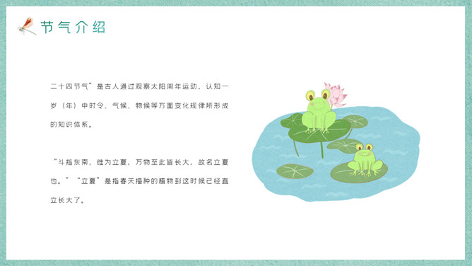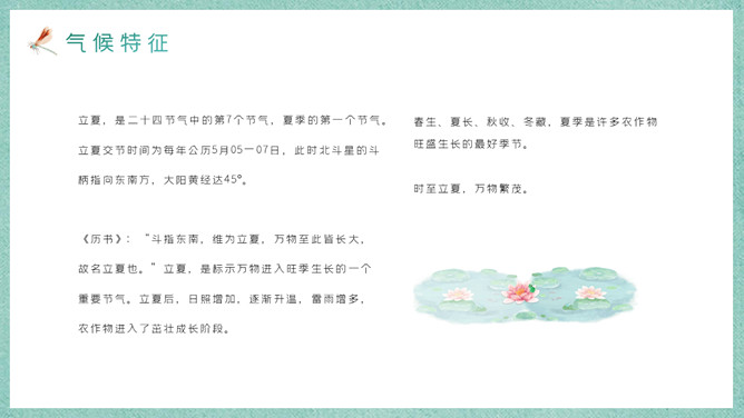 荷花立夏节气主题PPT模板。立夏表示告别春天,是夏天的开始。春生、夏长、秋收、冬藏,时至立夏,万物繁茂。由于我国幅员辽阔、南北跨度大,各地自然节律不一。