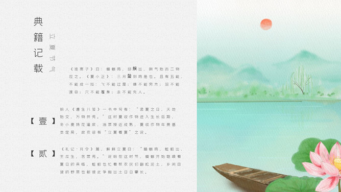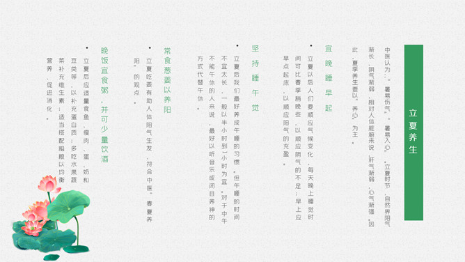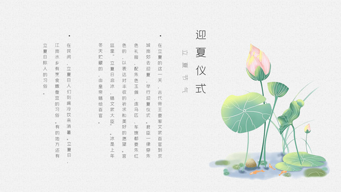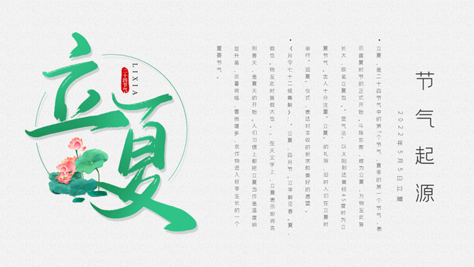 青蛙立夏节气介绍PPT模板。明人《遵生八笺》一书中写有:“孟夏之日,天地始交,万物并秀。”这时夏收作物进入生长后期,冬小麦扬花灌浆,油菜接近成熟,夏收作物年景基本定局,故农谚有“立夏看夏”之说。