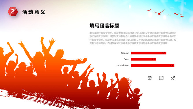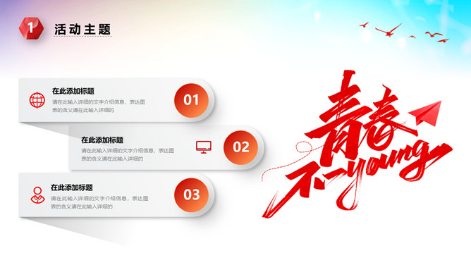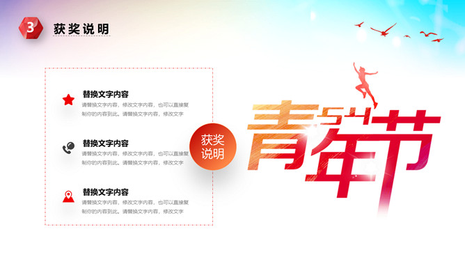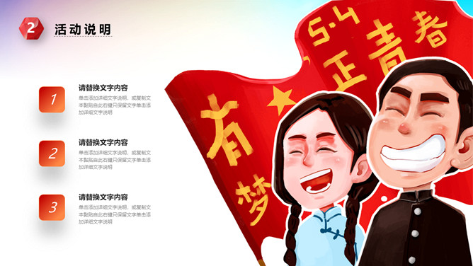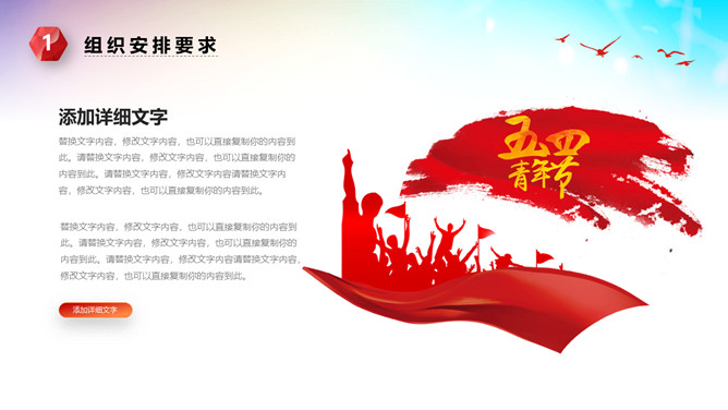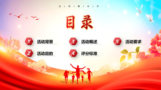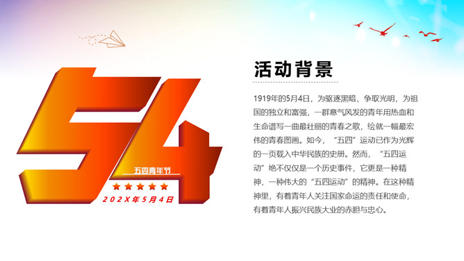 五四青年节演讲活动PPT模板。1919年的5月4日,为驱逐黑暗、争取光明,为祖国的独立和富强,一群意气风发的青年用热血和生命谱写一曲最壮丽的青春之歌,绘就一幅最宏伟的青春图画。