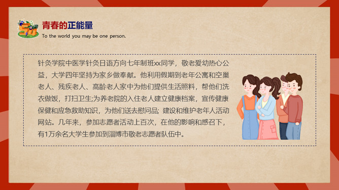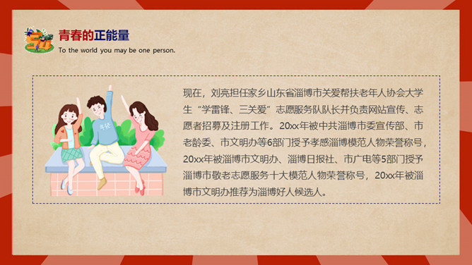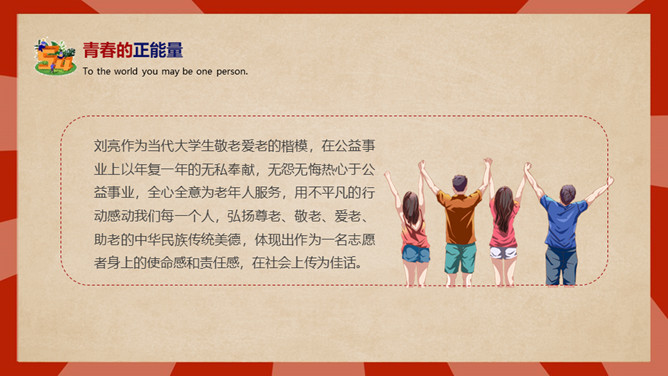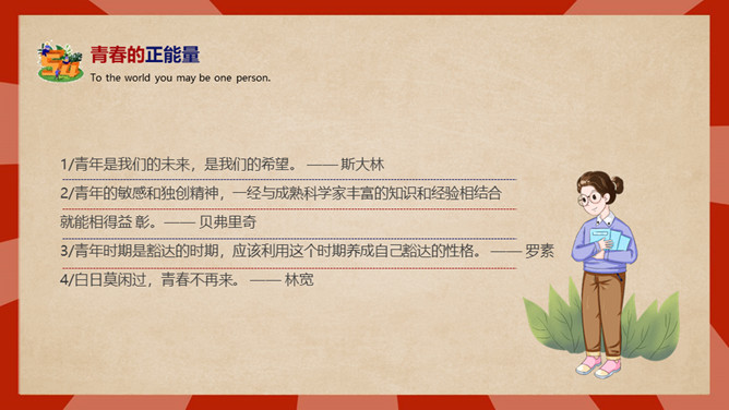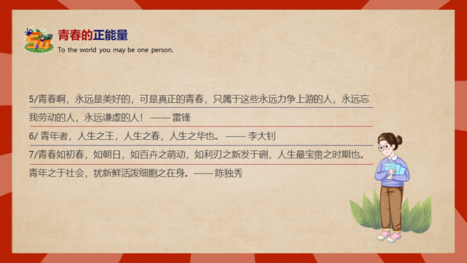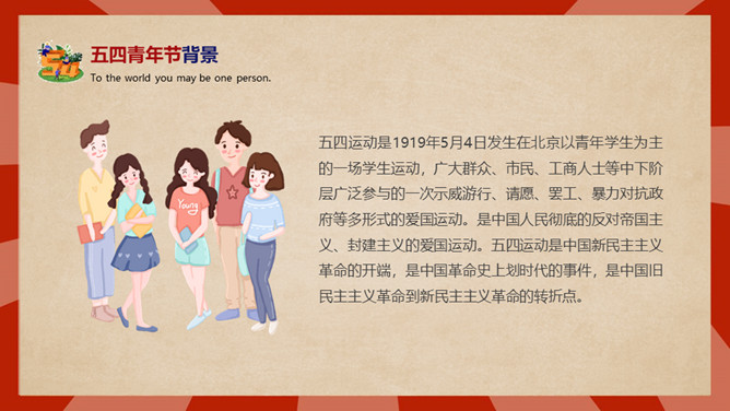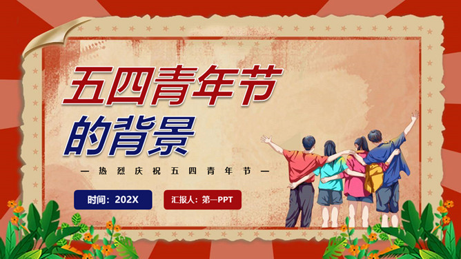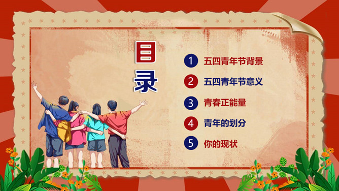 庆祝五四青年节PPT模板。内容包括五四青年节背景、五四青年节意义、青春正能量、青年的划分、你的现状。