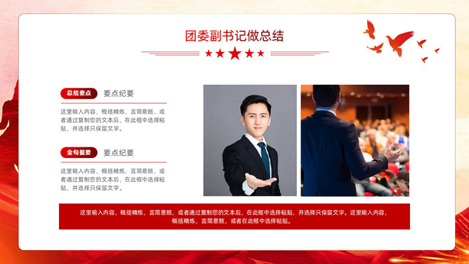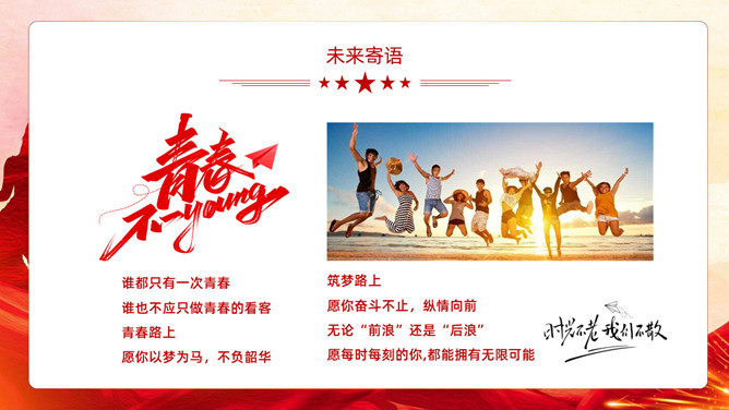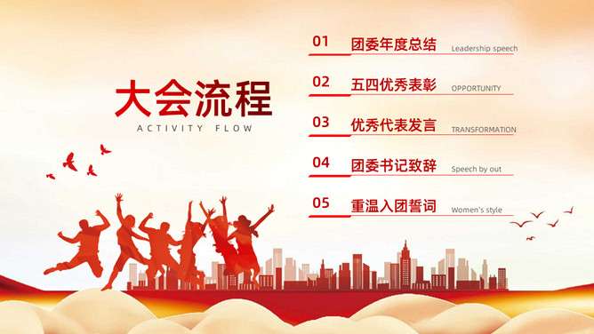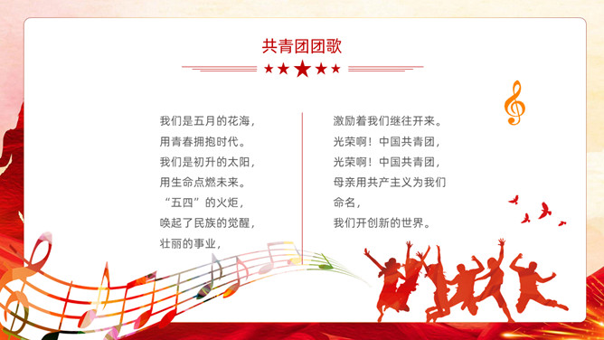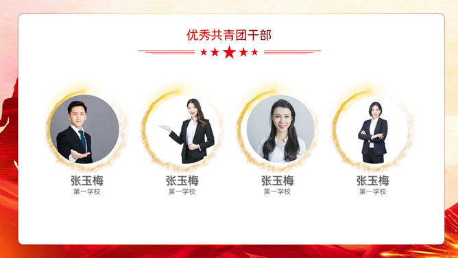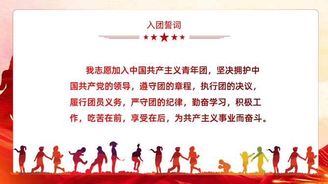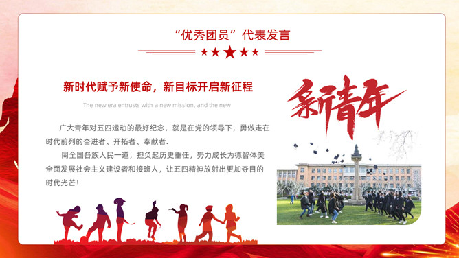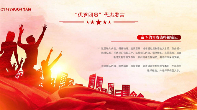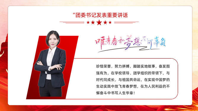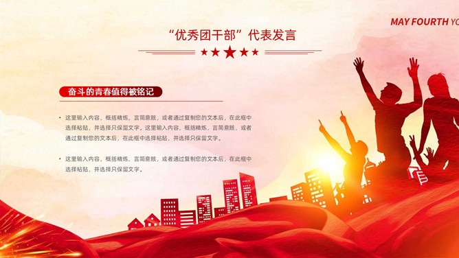 五四青年节表彰大会PPT模板。内容包括团委年度总结、五四优秀表彰、优秀代表发言、团委书记致辞、重温入团誓词。