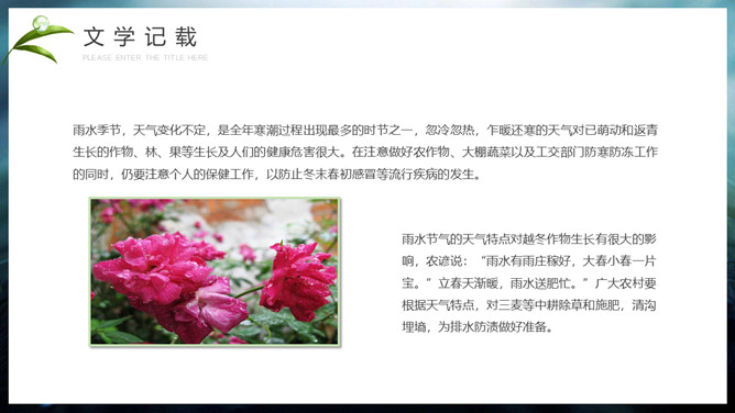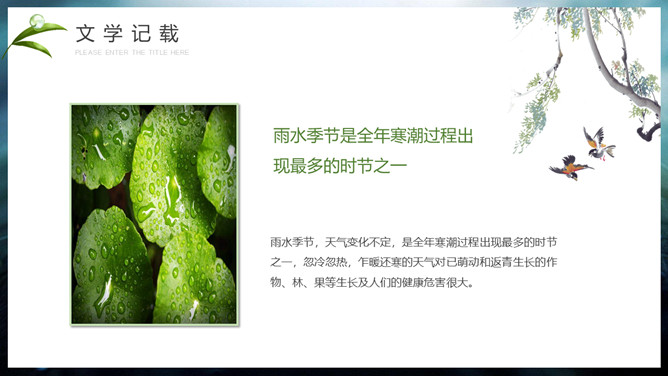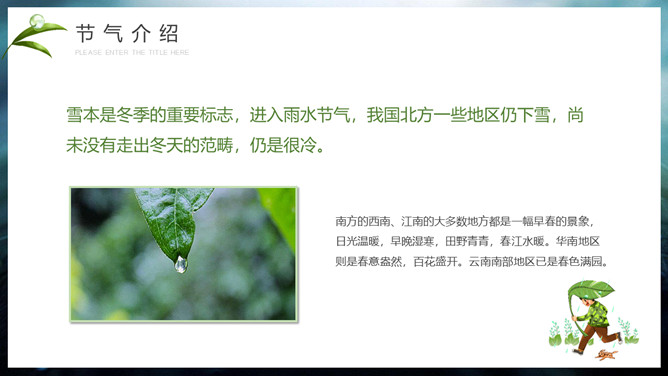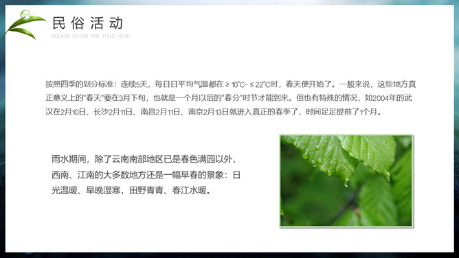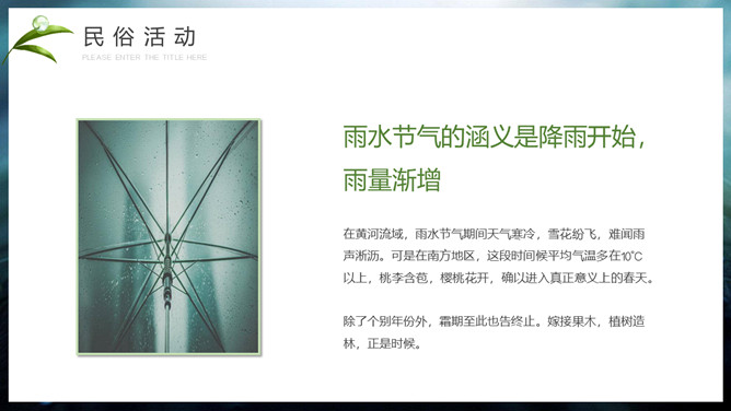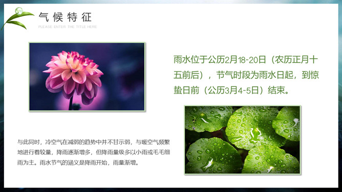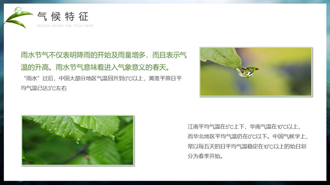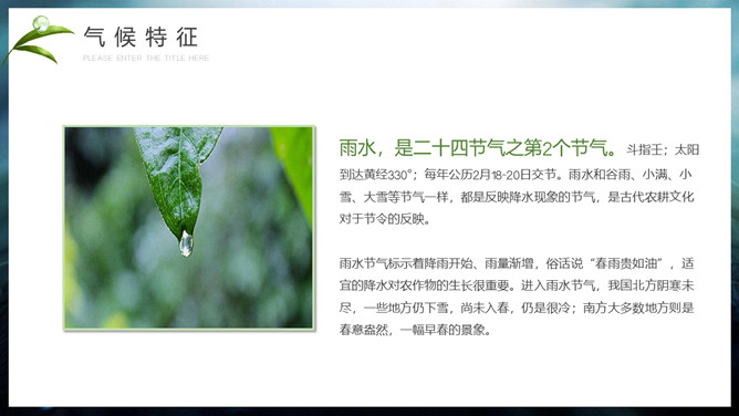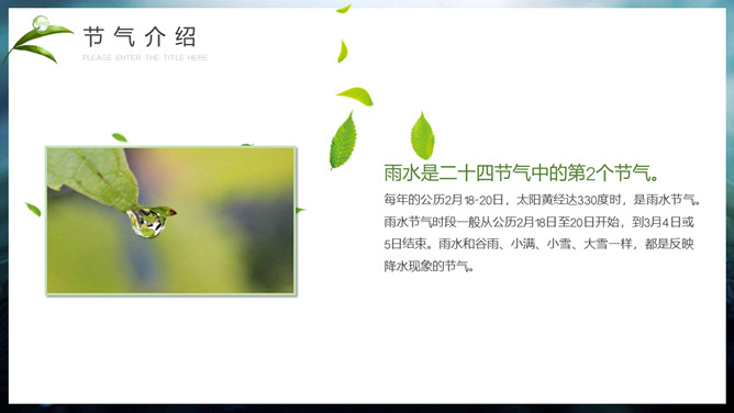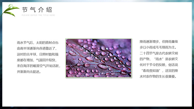 水珠雨水节气介绍PPT模板。雨水节气不仅表明降雨的开始及雨量增多,而且表示气温的升高。雨水节气意味着进入气象意义的春天。“雨水”过后,中国大部分地区气温回升到0℃以上,黄淮平原日平均气温已达3℃左右。