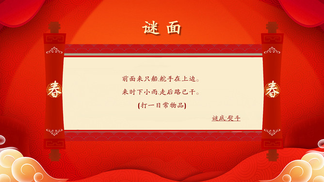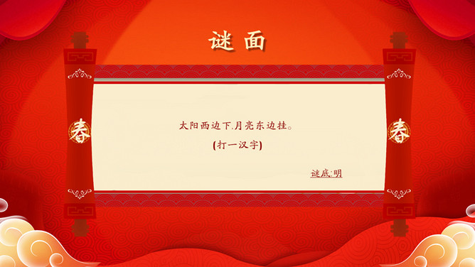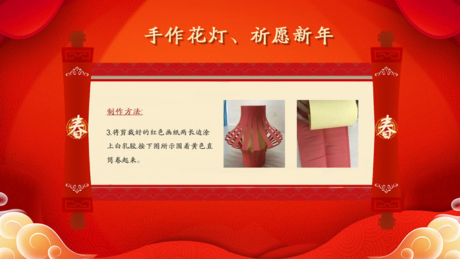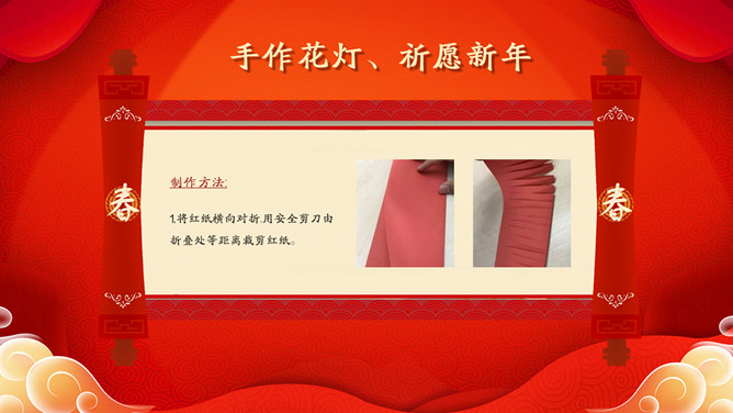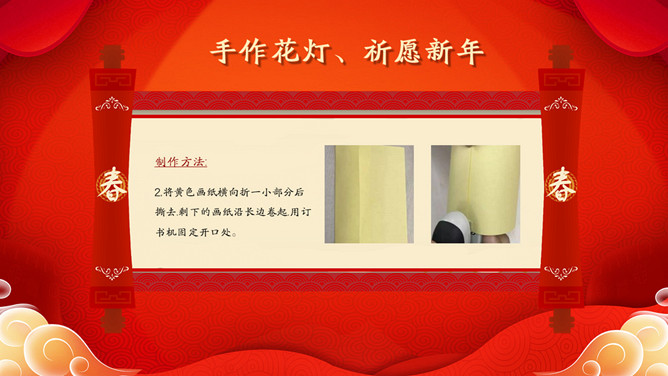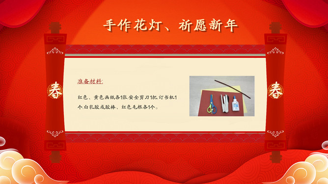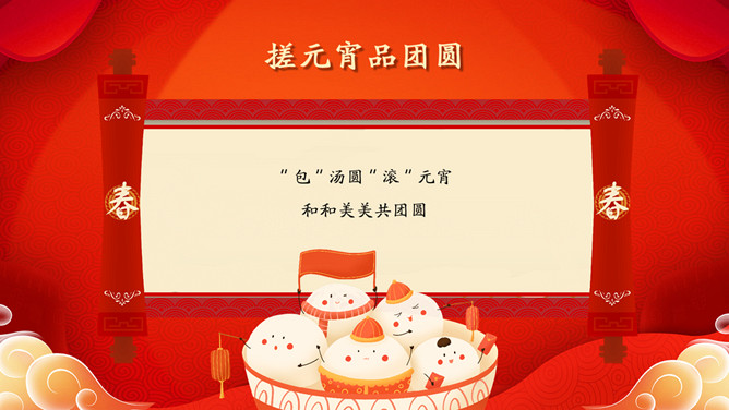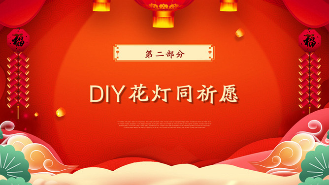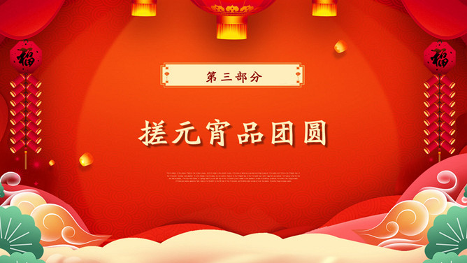 元宵佳节活动PPT模板。内容包括元宵灯谜猜猜猜、DIY花灯同祈愿、搓元宵品团圆。