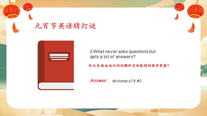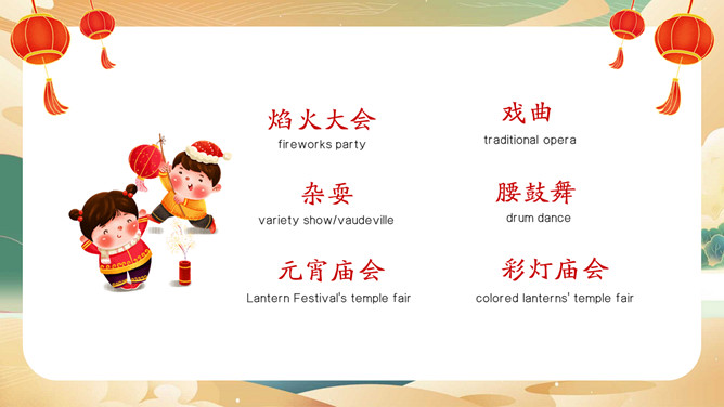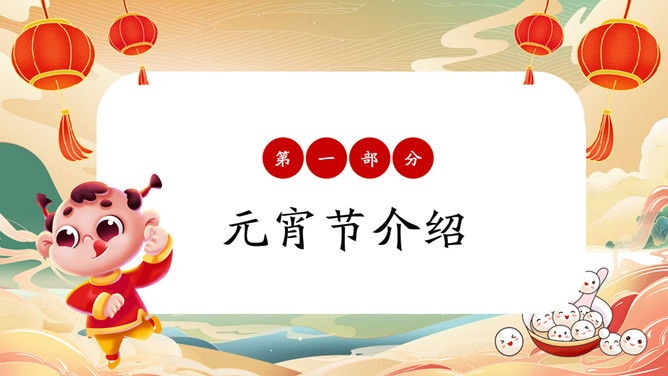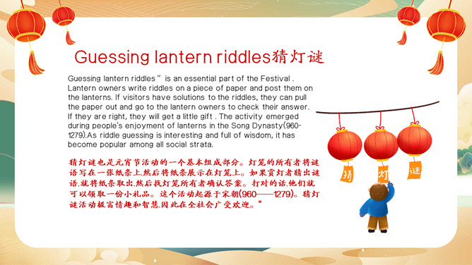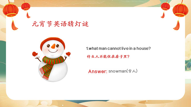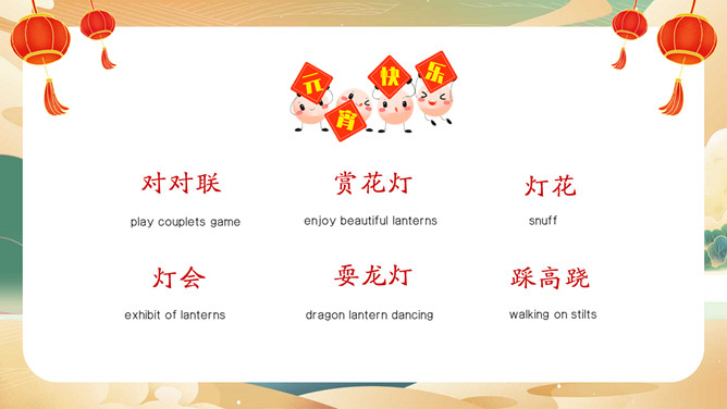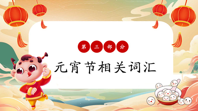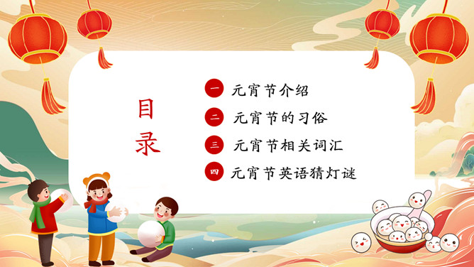 元宵节英文介绍班会PPT模板。内容包括元宵节介绍、元宵节的习俗、元宵节相关词汇、元宵节英语猜灯谜。