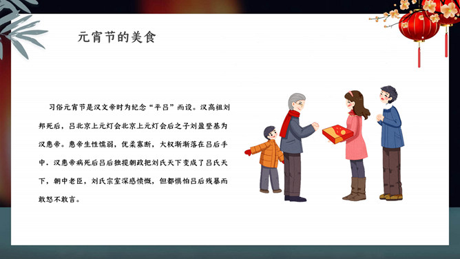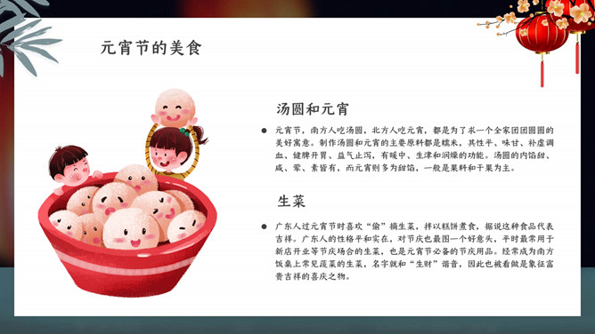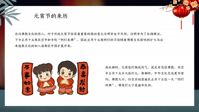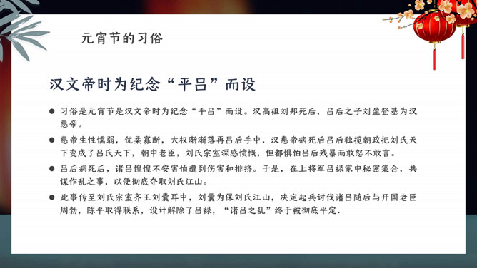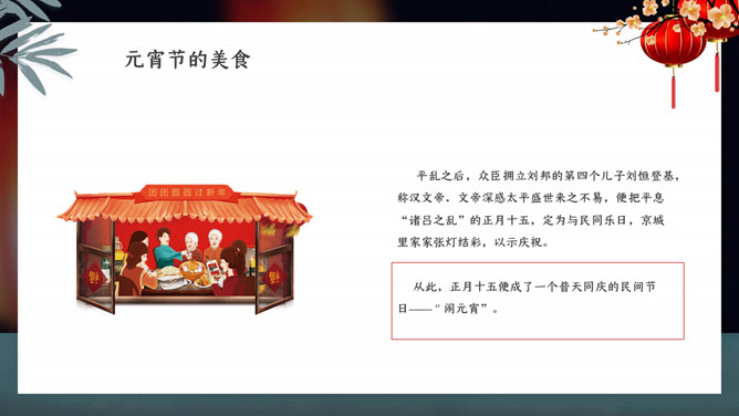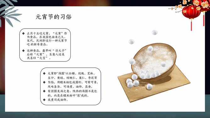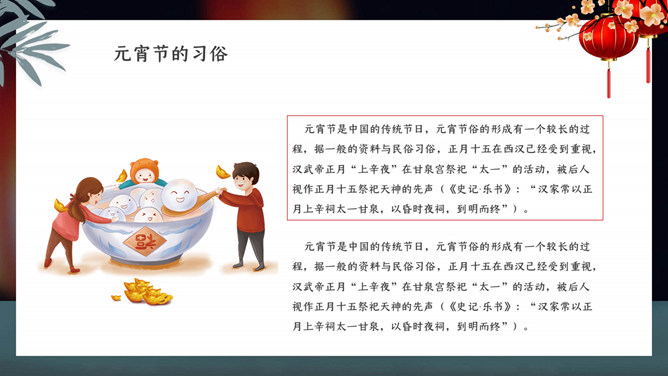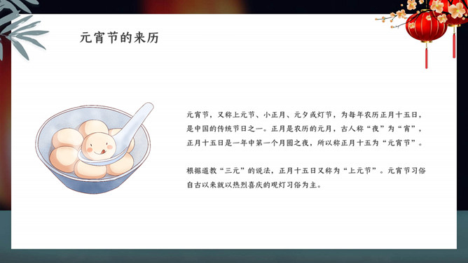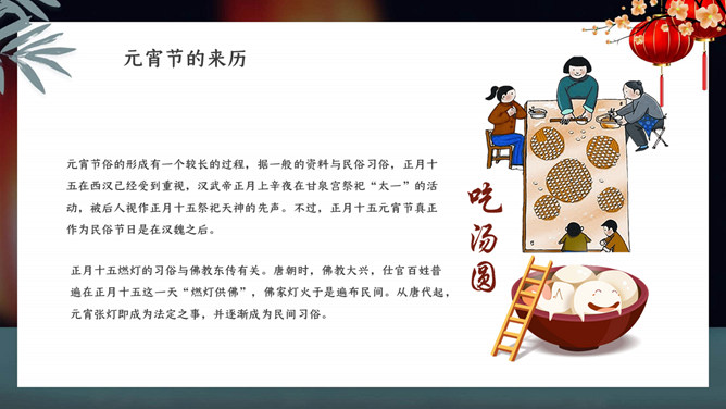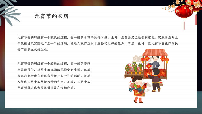 元宵佳节介绍PPT模板。元宵节俗的形成有一个较长的过程,据一般的资料与民俗习俗,正月十五在西汉已经受到重视,汉武帝正月上辛夜在甘泉宫祭祀“太一”的活动,被后人视作正月十五祭祀天神的先声。不过,正月十五元宵节真正作为民俗节日是在汉魏之后。