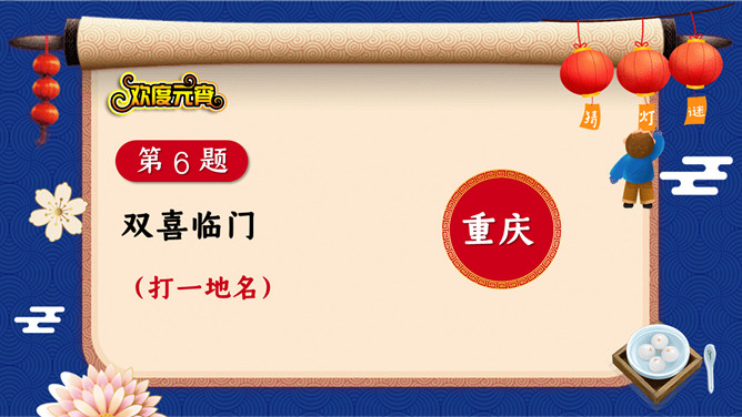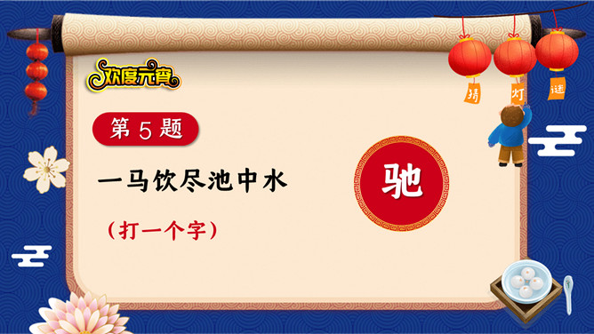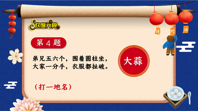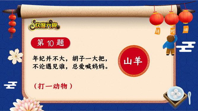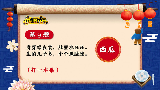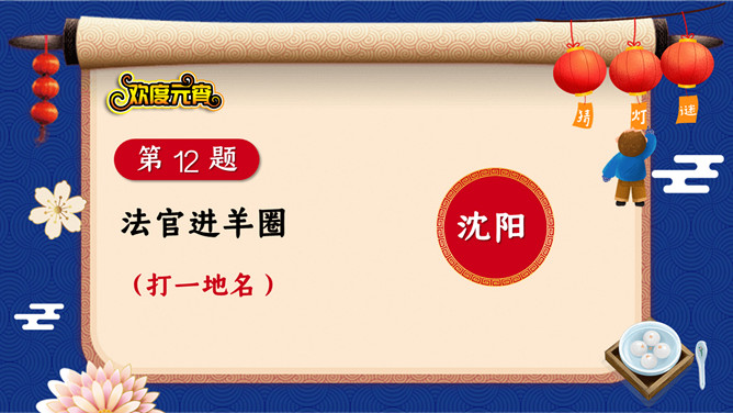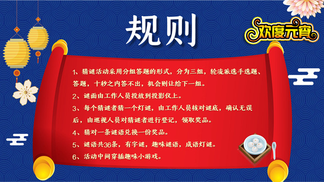 1、猜谜活动采用分组答题的形式,分为三组,轮流派选手选题、答题,十秒之内答不出,机会则让给下一组。2、谜面由工作人员投放到投影仪上。3、每个猜谜者猜一个灯谜,由工作人员核对谜底,确认无误后,由巡视人员对猜谜者进行登记,领取奖品。