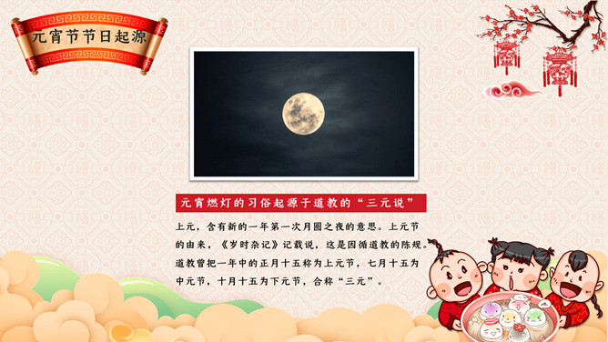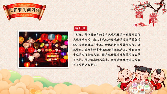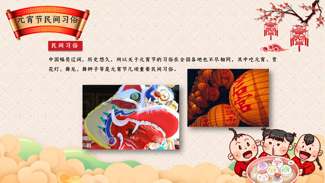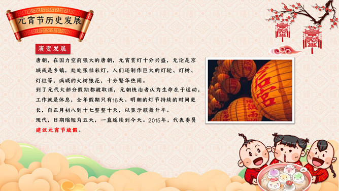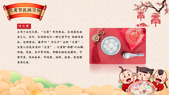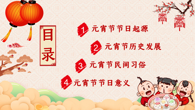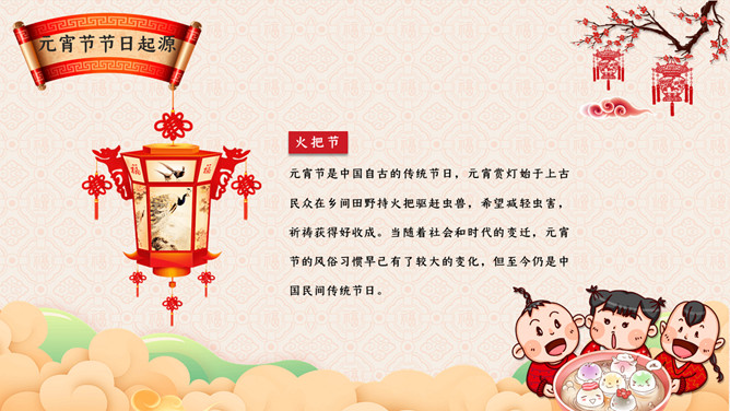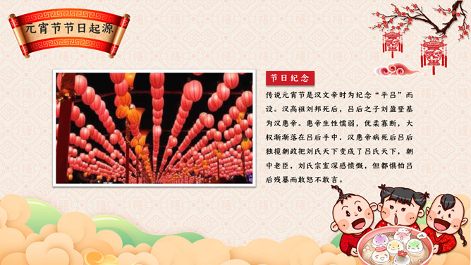 元宵节主题班会PPT模板。传说元宵节是汉文帝时为纪念“平吕”而设。汉高祖刘邦死后,吕后之子刘盈登基为汉惠帝。惠帝生性懦弱,优柔寡断,大权渐渐落在吕后手中.汉惠帝病死后吕后独揽朝政把刘氏天下变成了吕氏天下,朝中老臣,刘氏宗室深感愤慨,但都惧怕吕后残暴而敢怒不敢言。