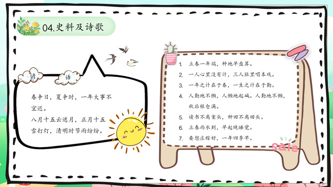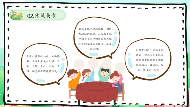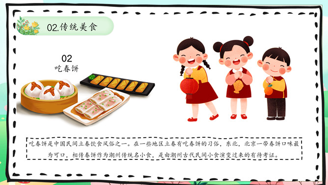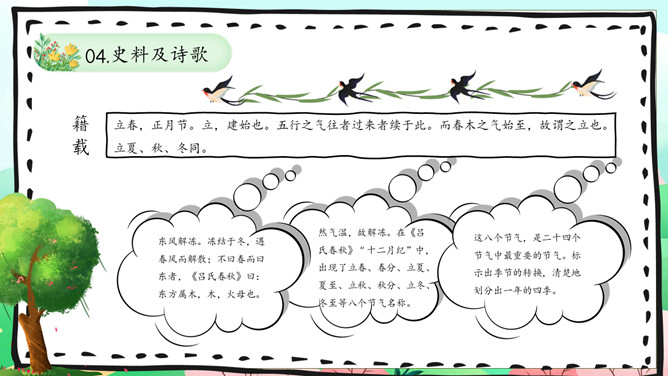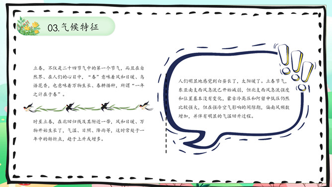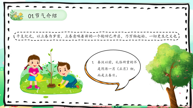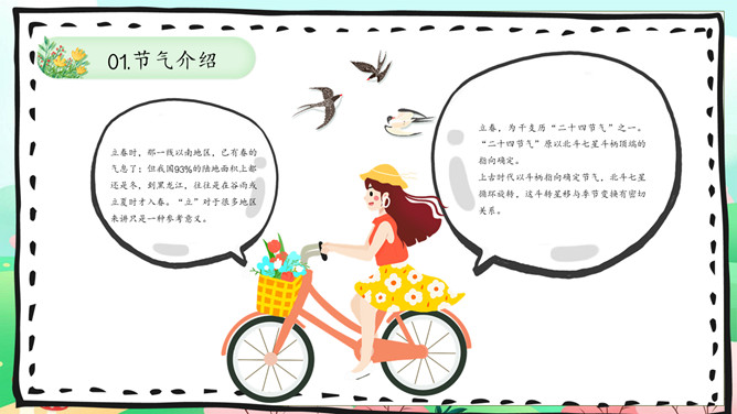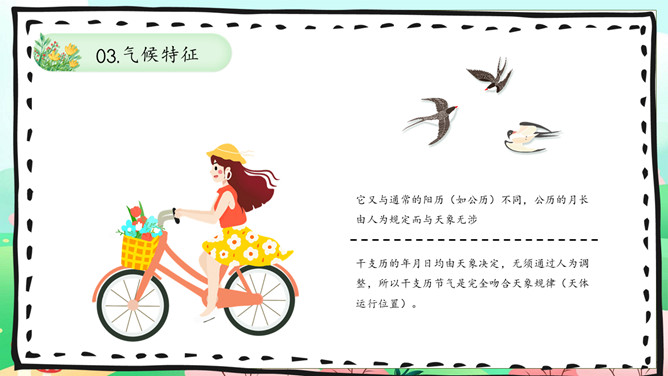 放风筝立春节气介绍PPT模板。立春时,那一线以南地区,已有春的气息了;但我国93%的陆地面积上都还是冬,到黑龙江,往往是在谷雨或立夏时才入春。“立”对于很多地区来讲只是一种参考意义。