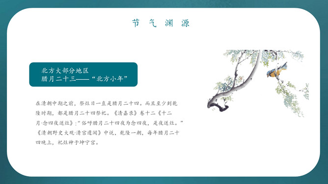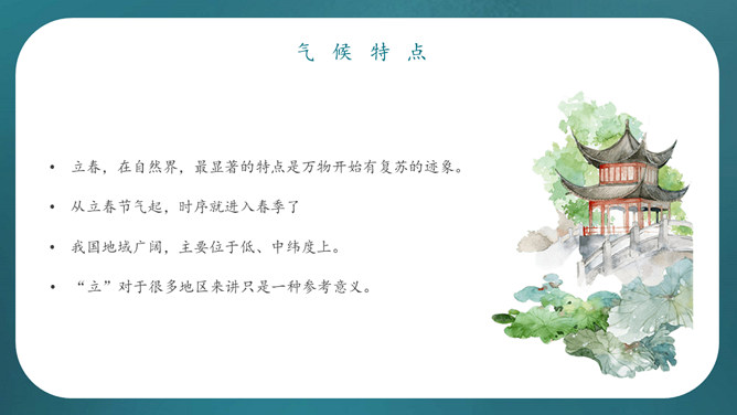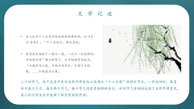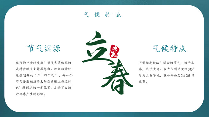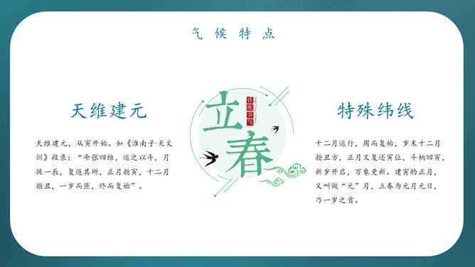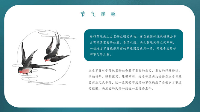 燕子花瓶立春节气PPT模板。立春岁首对于传统农耕社会具有重要的意义,重大的拜神祭祖、纳福祈年、驱邪攘灾、除旧布新、迎春等庆典均安排在立春日及其前后几天举行,这一系列的节庆活动不仅构成了后世岁首节庆的框架,而且它的民俗功能也一直遗存至今。