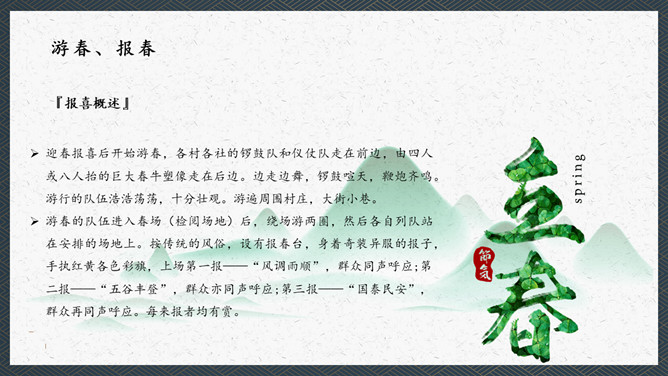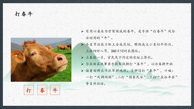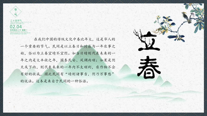 在我们中国的传统文化中春比年大,这是华人的一个重要的节气。民间是以立春日和时辰为一年农事之始,俗以为立春宜晴不宜阴。如当日晴则代表未来的一年之内是大丰收之年,国泰民安、风调雨顺;如果是阴天或下雨,则代表未来的一年内不太顺利,农作物不会有好的收成,因此民间有“晴则诸事吉,阴乃万事愁”的说法。这本是来自于民间的一种俗语。
