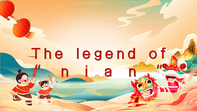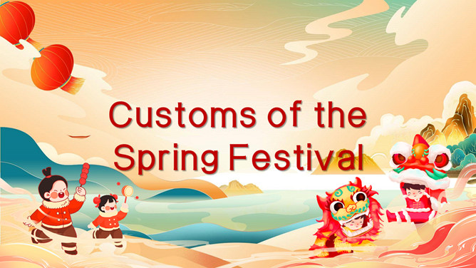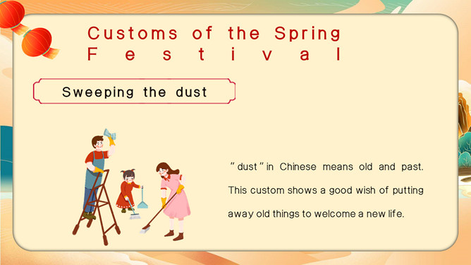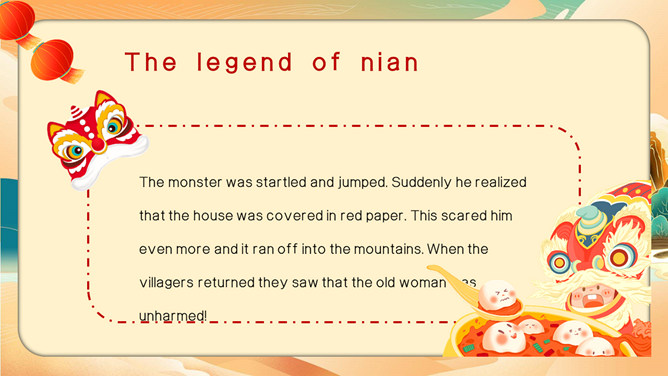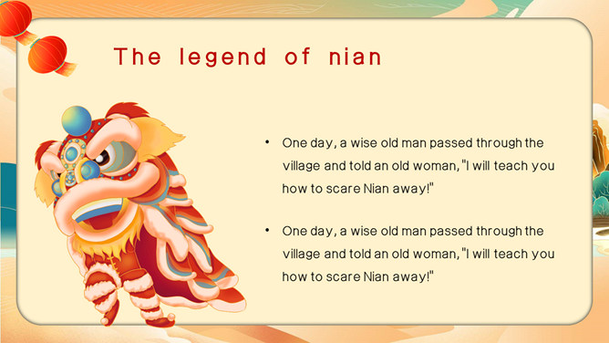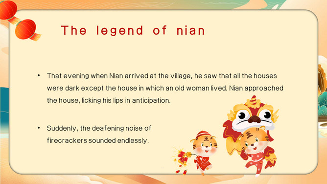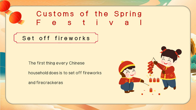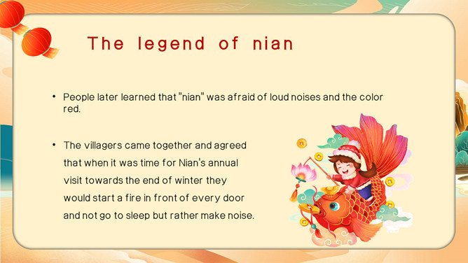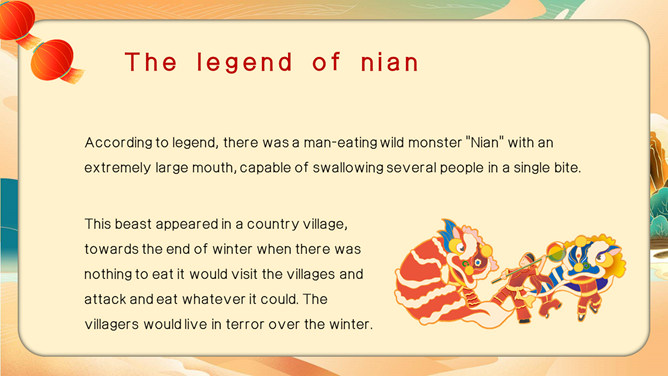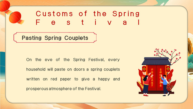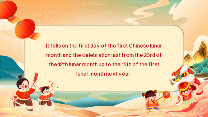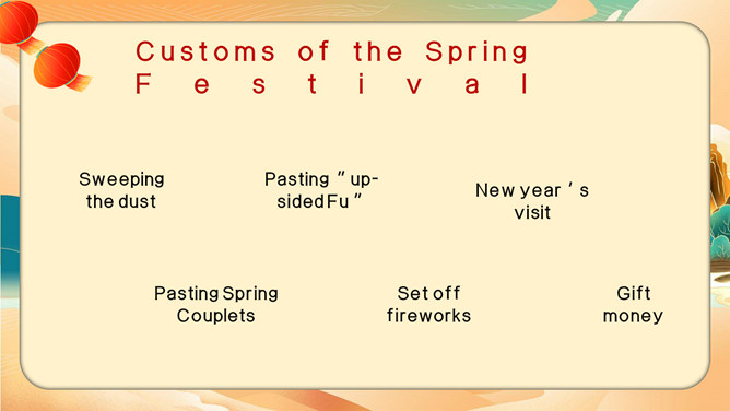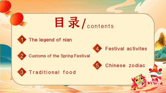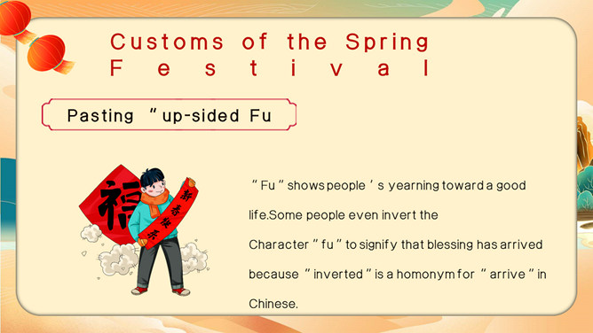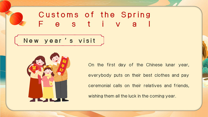 恭贺新春春节英文介绍PPT模板。一套英文介绍春节模板,国潮卡通风格设计,喜庆红灯笼装饰。