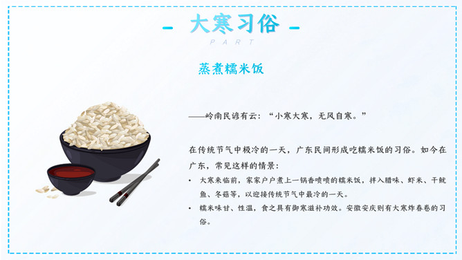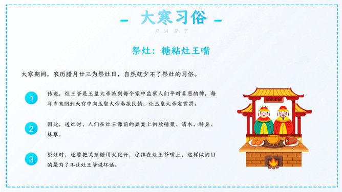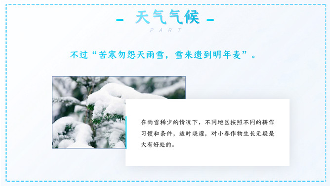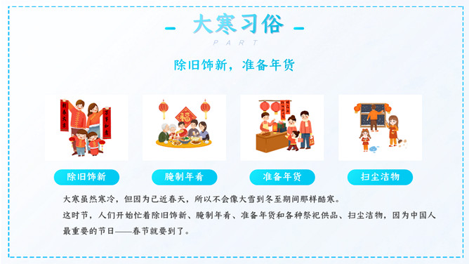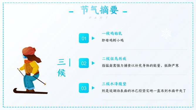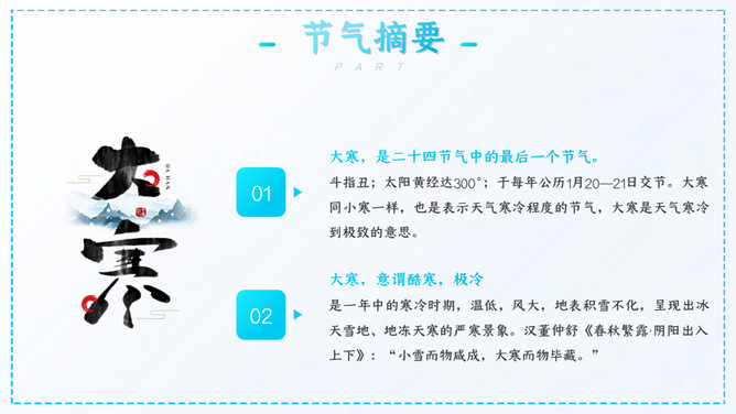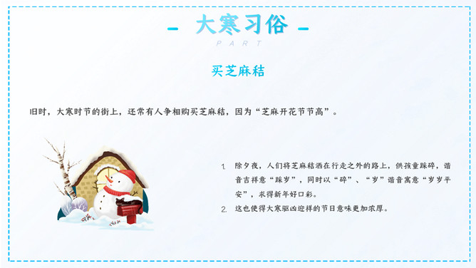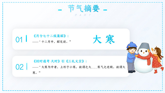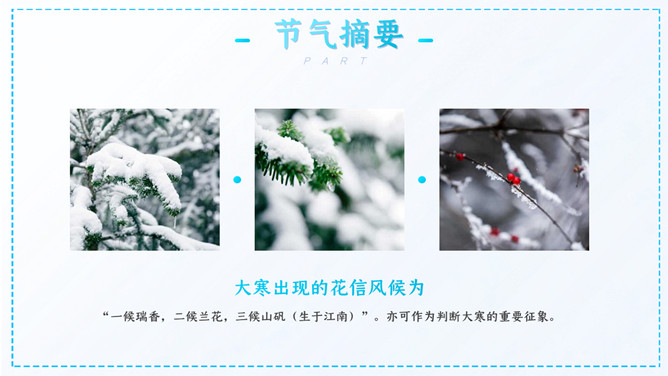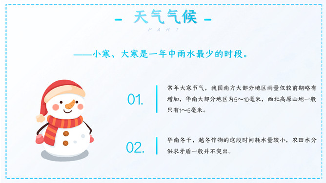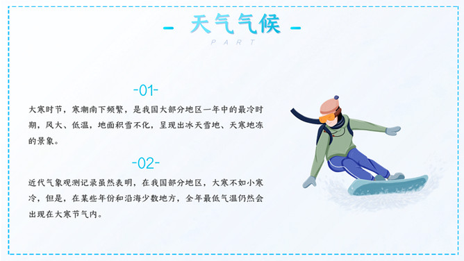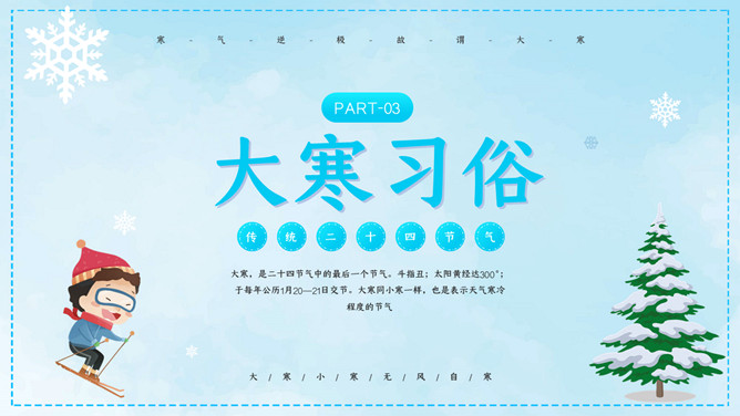 雪花雪人大寒节气PPT模板。大寒时节,寒潮南下频繁,是我国大部分地区一年中的最冷时期,风大、低温,地面积雪不化,呈现出冰天雪地、天寒地冻的景象。