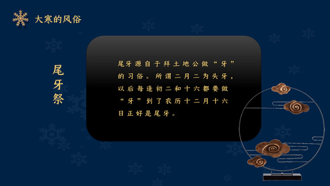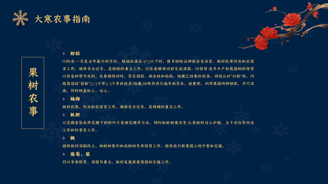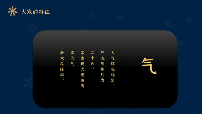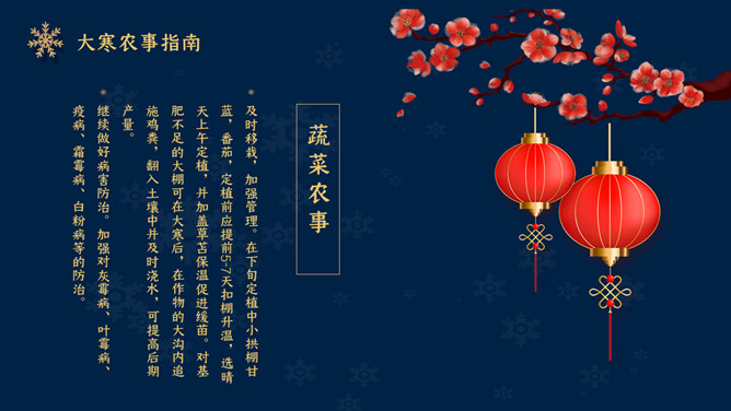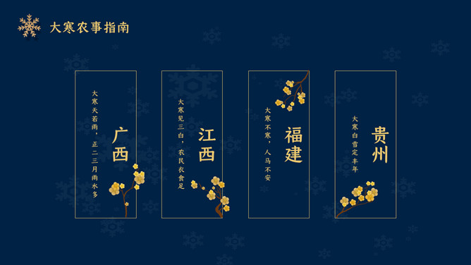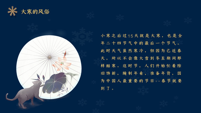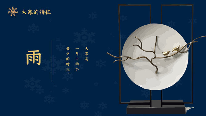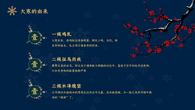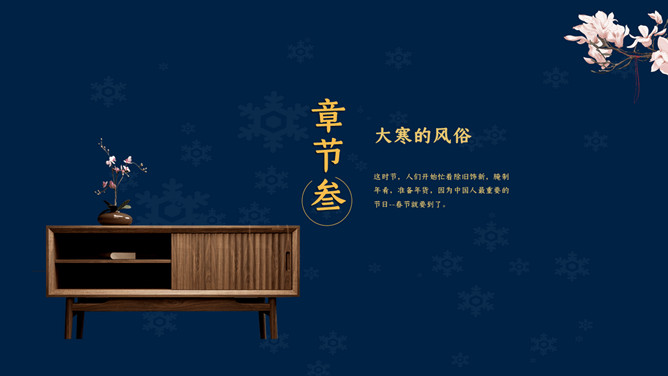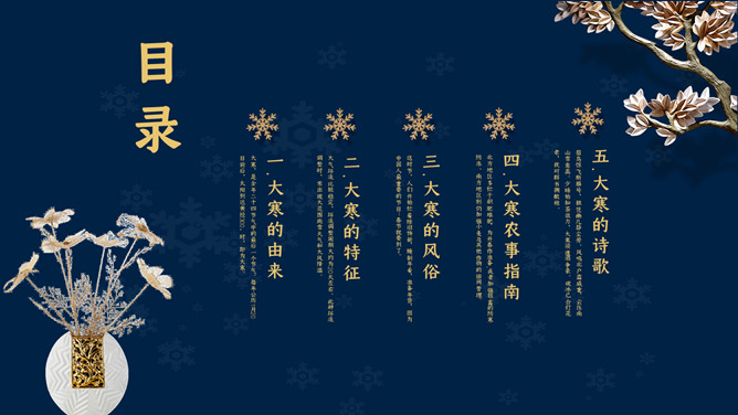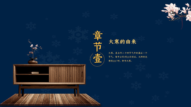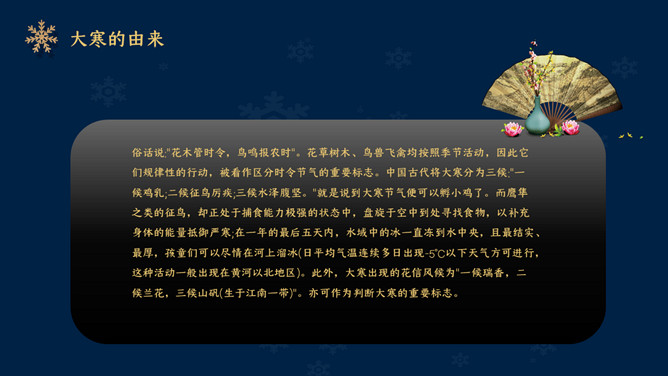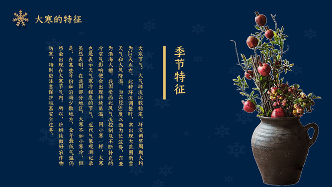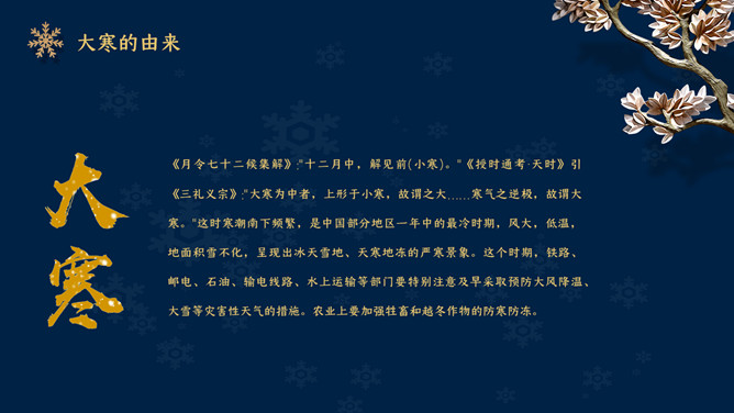 花朵大寒节气主题PPT模板。大寒节气,大气环流比较稳定,环流调整周期大约为20天左右。此种环流调整时,常出现大范围雨雪天气和大风降温。