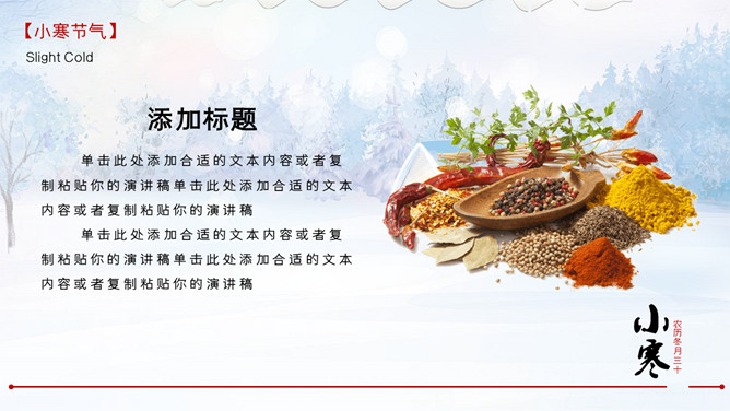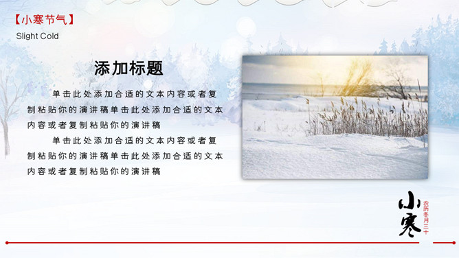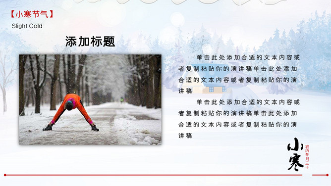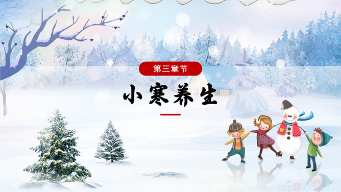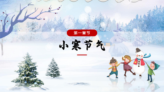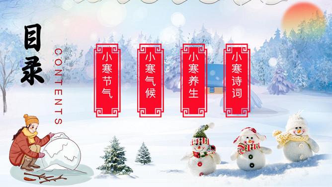 雪地雪人小寒节气PPT模板。一套小寒节气主题模板,冰天雪地雪人、松树、背景。