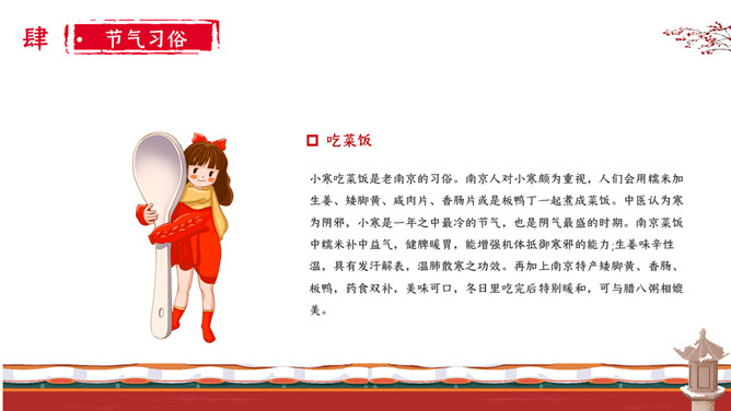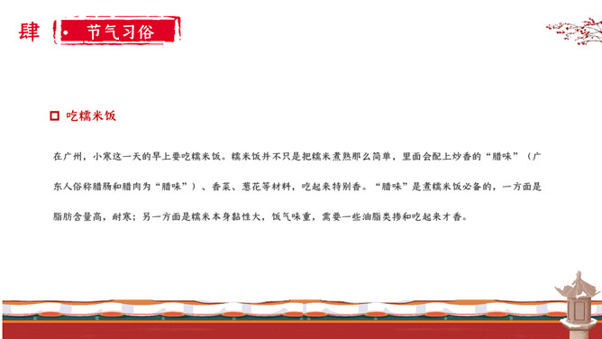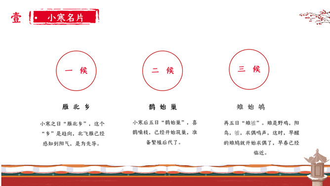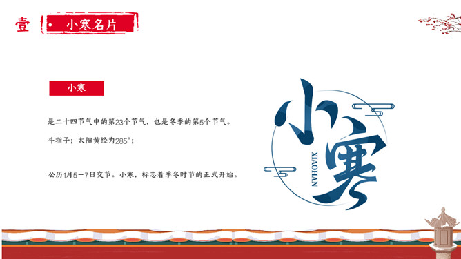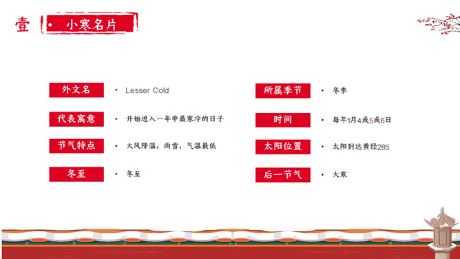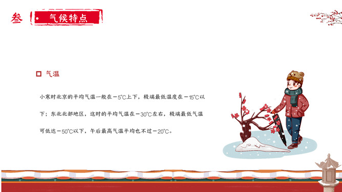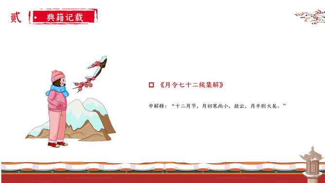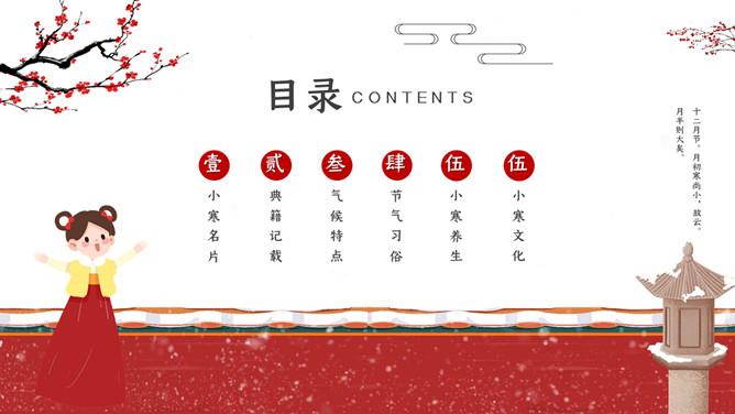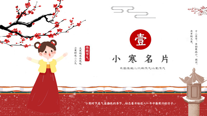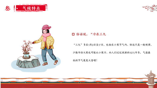 女孩梅花小寒节气PPT模板。小寒时北京的平均气温一般在-5℃上下,极端最低温度在-15℃以下;东北北部地区,这时的平均气温在-30℃左右,极端最低气温可低达-50℃以下,午后最高气温平均也不过-20℃。