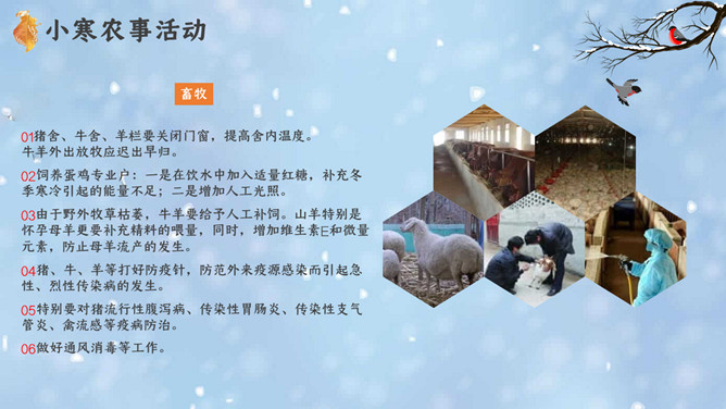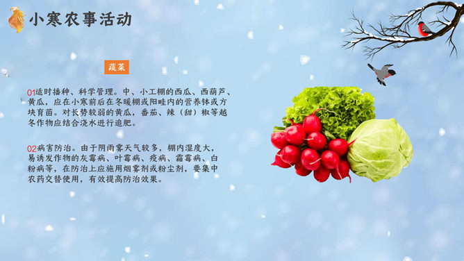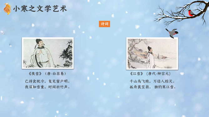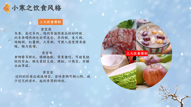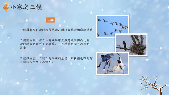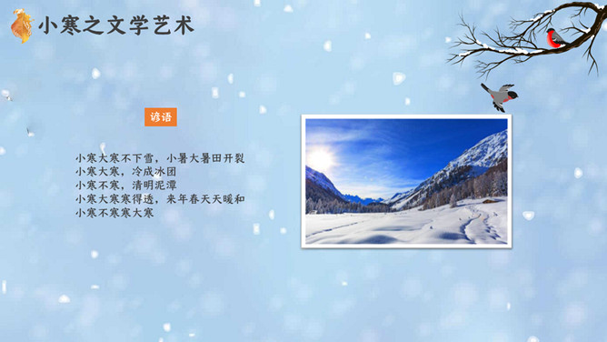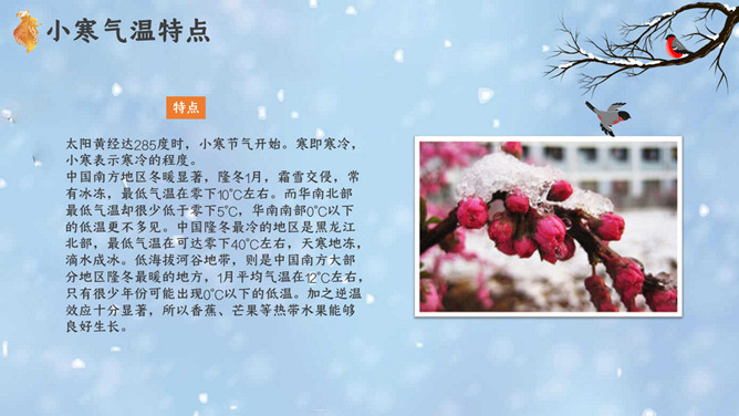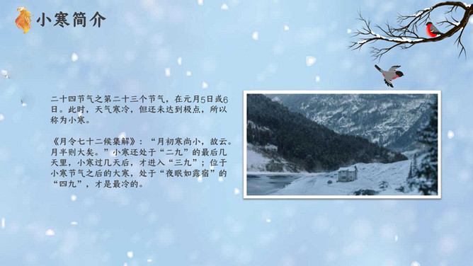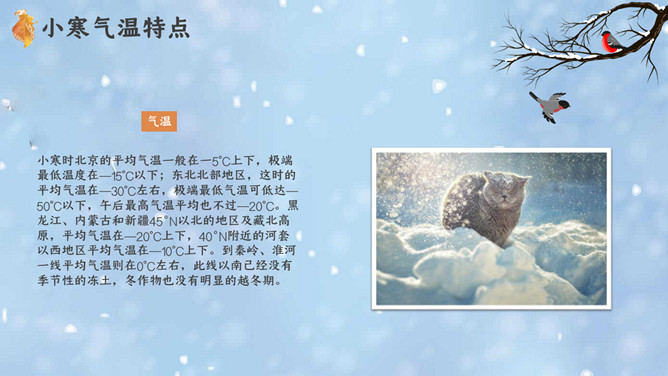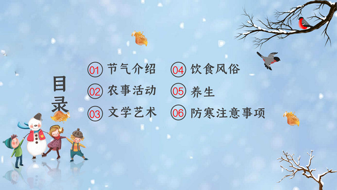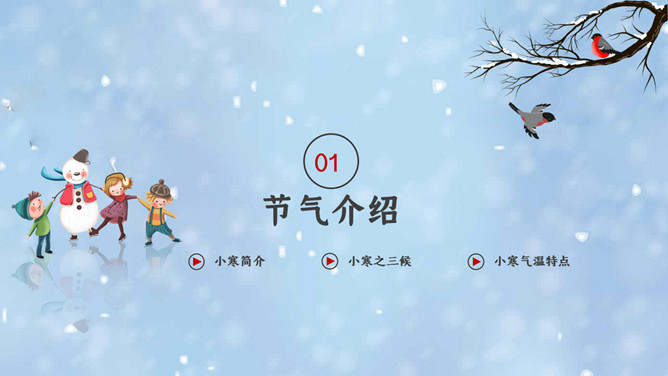 小朋友雪人小寒节气PPT模板。二十四节气之第二十三个节气,在元月5日或6日。此时,天气寒冷,但还未达到极点,所以称为小寒。