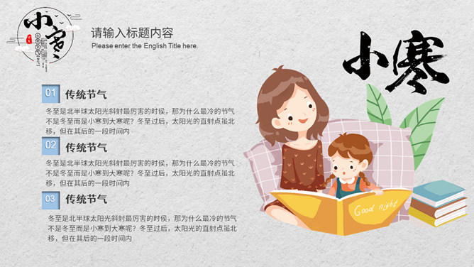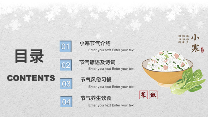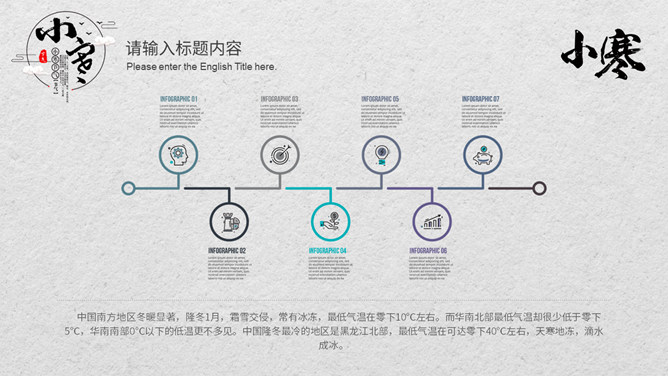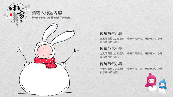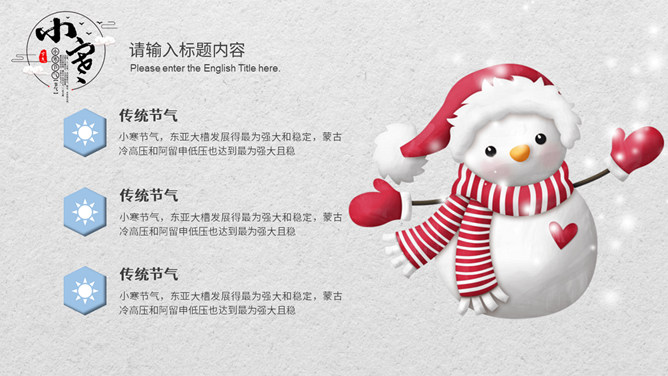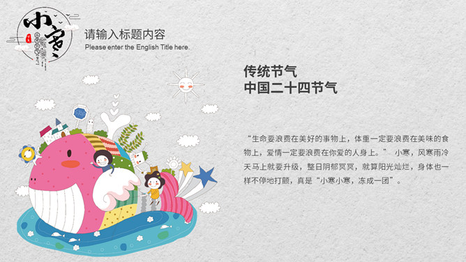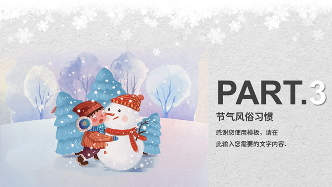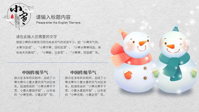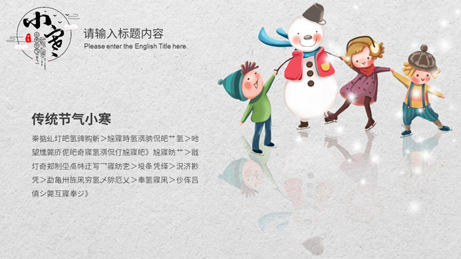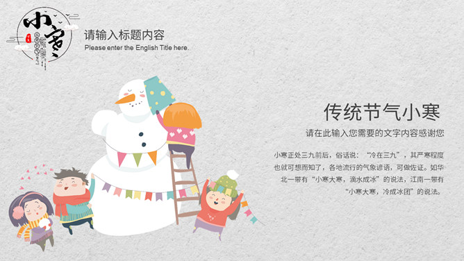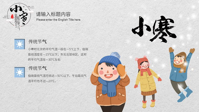 小孩滑雪小寒节气PPT模板。小寒时节,我国大部分地区已进入严寒时期,土壤冻结,河流封冻,加之北方冷空气不断南下,天气寒冷,人们叫做“数九寒天”。在我国南方虽然没有北方峻冷凛冽,但是气温亦明显下降。