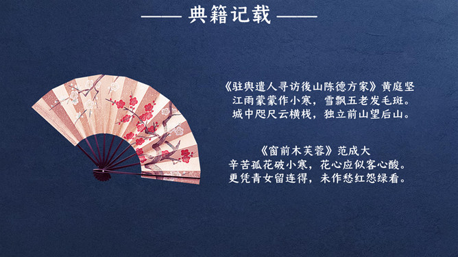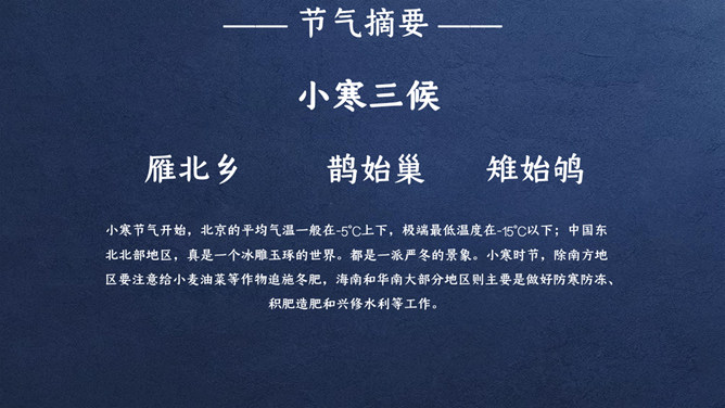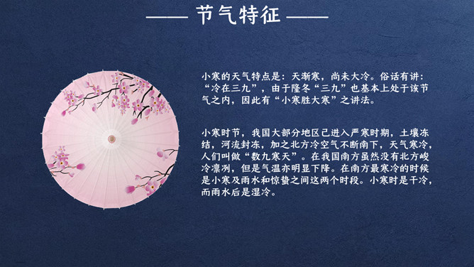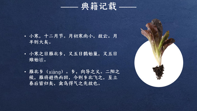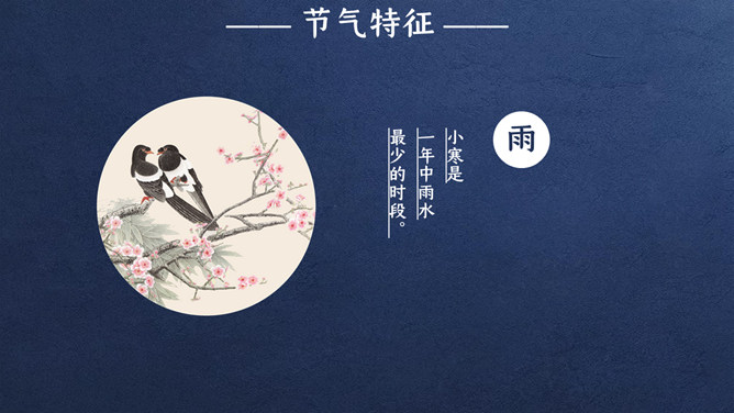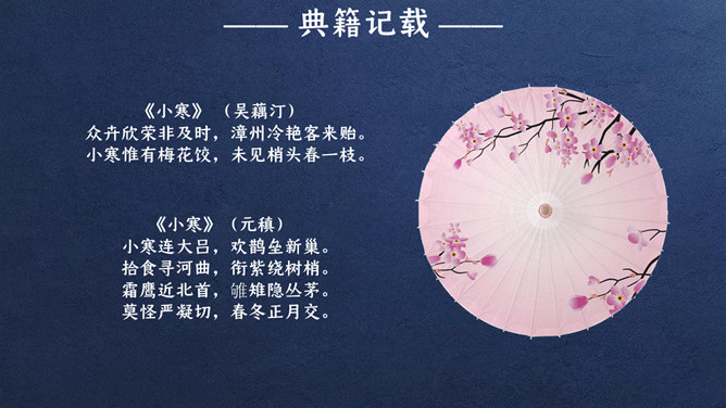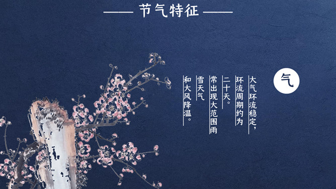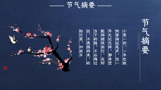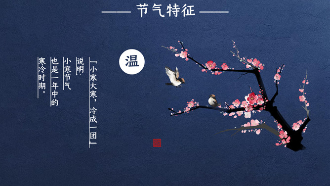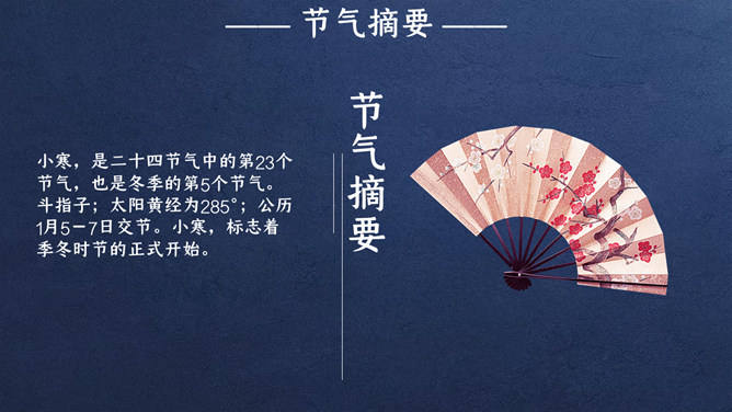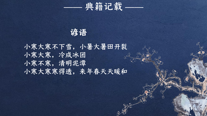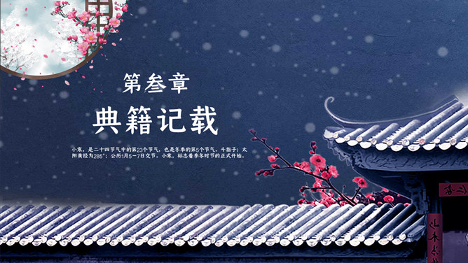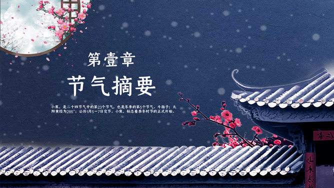 下雪梅花小寒节气PPT模板。小寒,是二十四节气中的第23个节气,也是冬季的第5个节气。斗指子;太阳黄经为285°;公历1月5-7日交节。小寒,标志着季冬时节的正式开始。