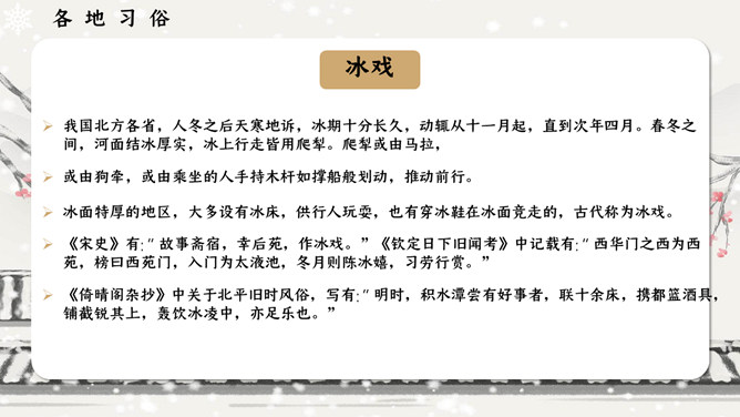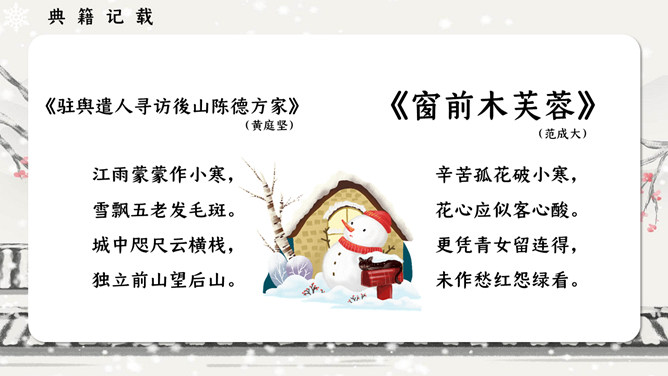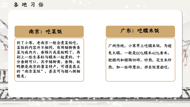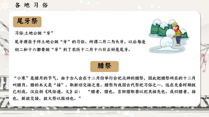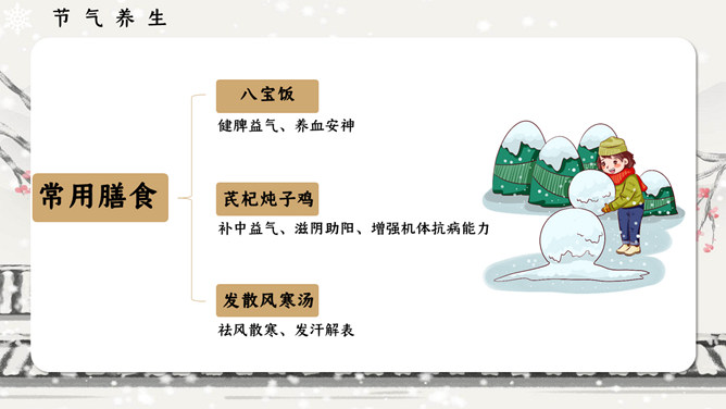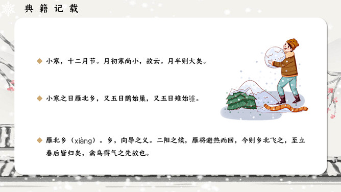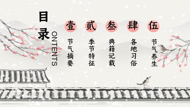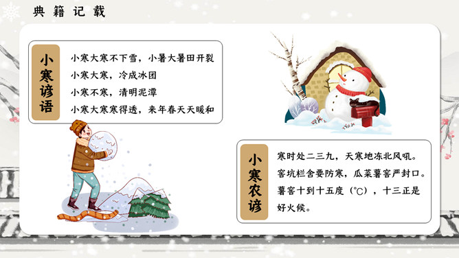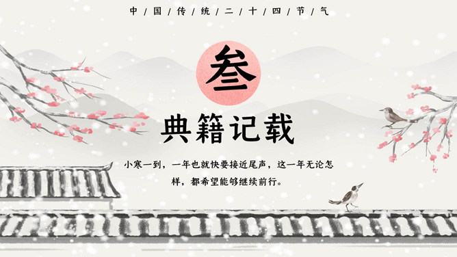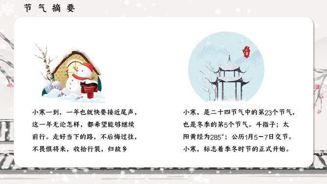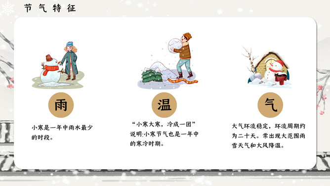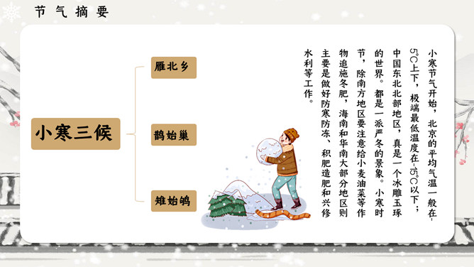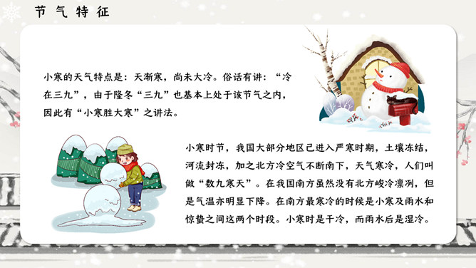 飘雪小寒节气介绍PPT模板。小寒的天气特点是:天渐寒,尚未大冷。俗话有讲:“冷在三九”,由于隆冬“三九”也基本上处于该节气之内,因此有“小寒胜大寒”之讲法。