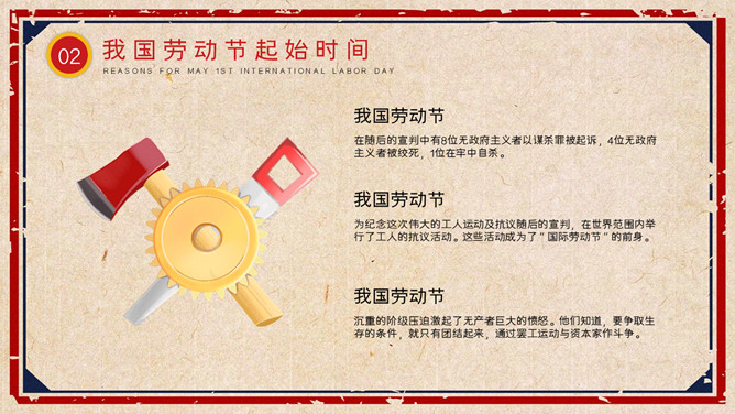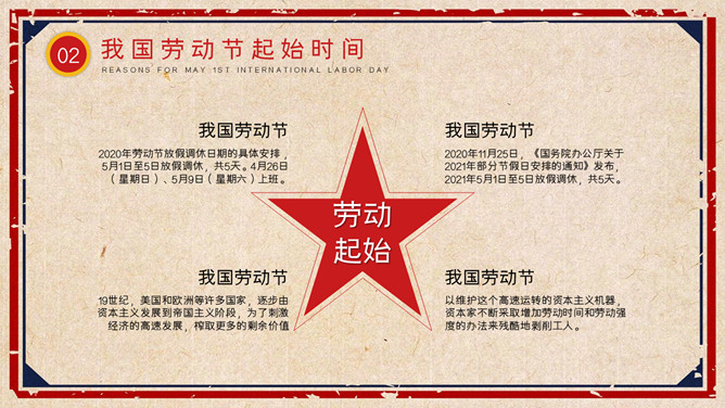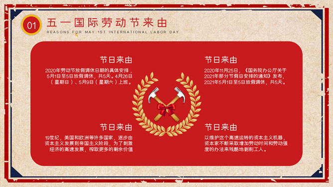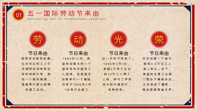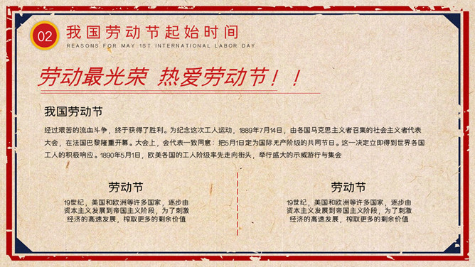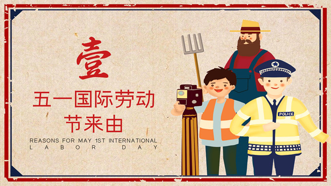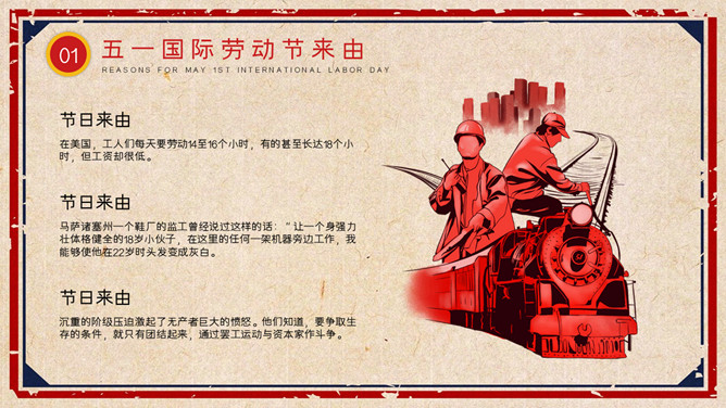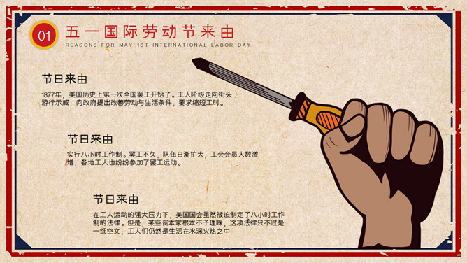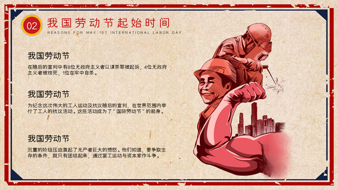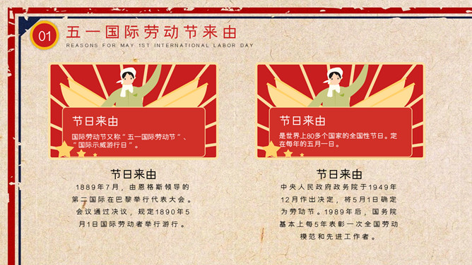 致敬平凡五一劳动节PPT模板。1889年7月,由恩格斯领导的第二国际在巴黎举行代表大会。会议通过决议,规定1890年5月1日国际劳动者举行游行。
