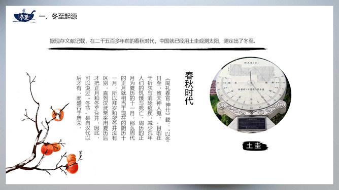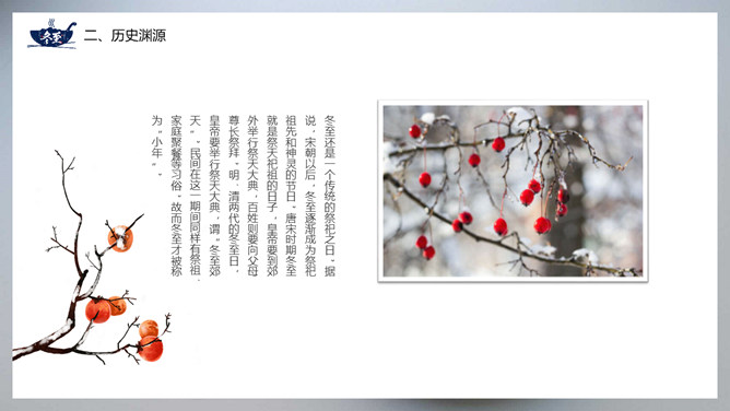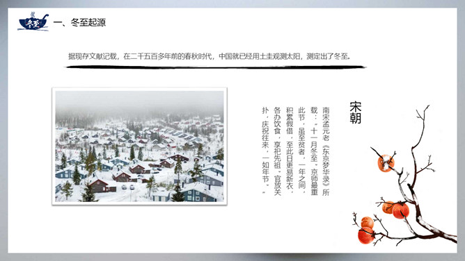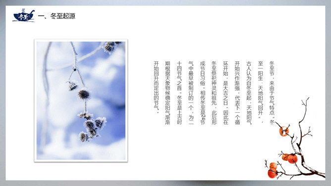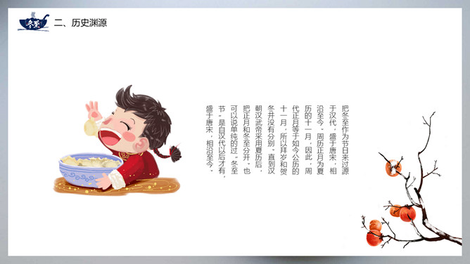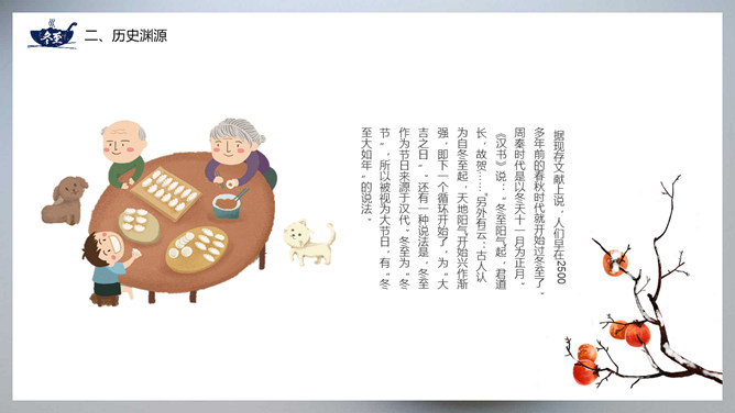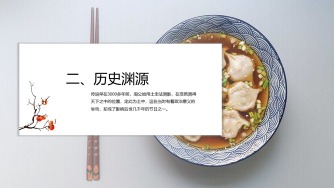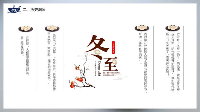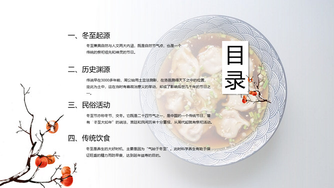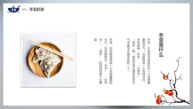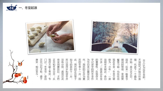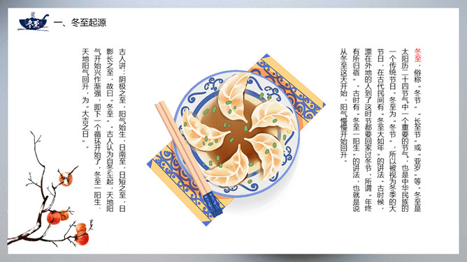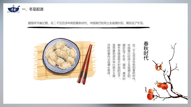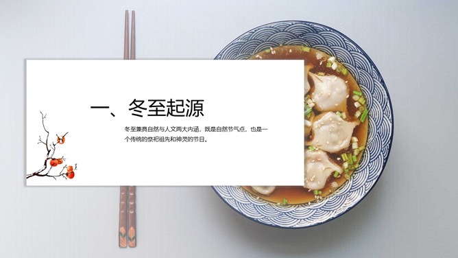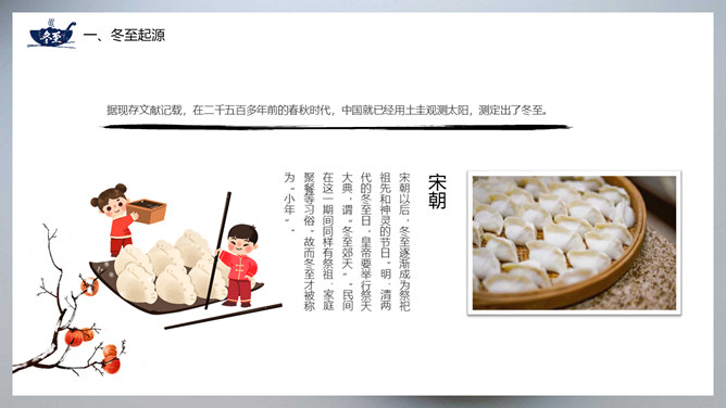 饺子冬至节气介绍PPT模板。冬至节亦称冬节、交冬。它既是二十四节气之一,是中国的一个传统节日,曾有“冬至大如年”的说法,宫廷和民间历来十分重视,从周代起就有祭祀活动。